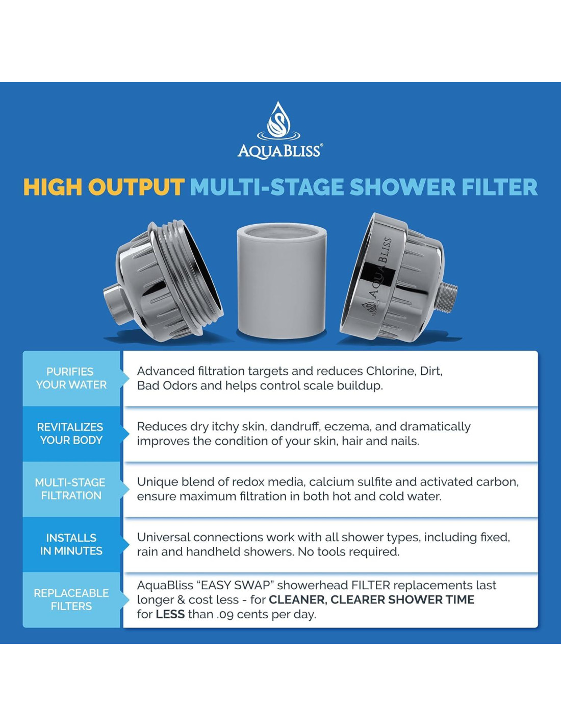 - Dura 2 veces más - Filtración Máxima en Agua Caliente y Fría - No Obstruirá tu Cabezal de Ducha - AquaBliss SFC200 aprovecha el poder de un medio de alta potencia, carbón activado de alta calidad, sulfato de calcio de grado spa - en un formato condensado que asegura que continúe reduciendo el nivel de toxinas irritantes en tu agua, sin suprimir el flujo de agua.