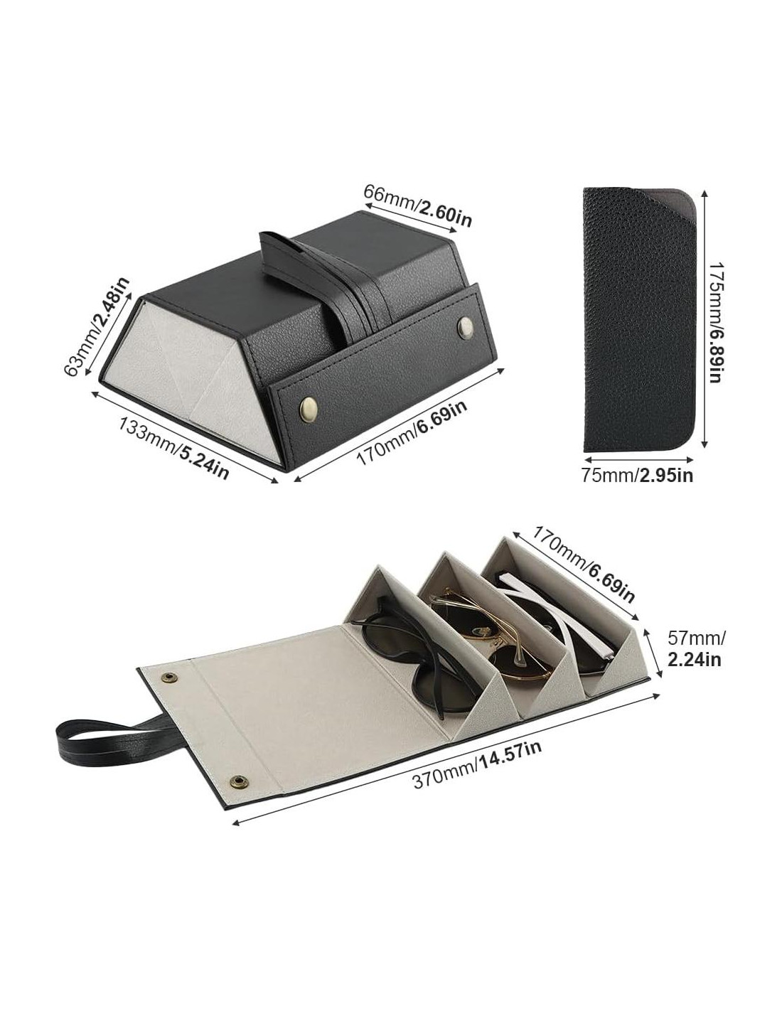 - Estuche de 3 RANURAS estuche de viaje para gafas de sol de 3 ranuras proporciona más espacio de almacenamiento. Se puede plegar en una caja, mide aproximadamente (L x W base x W superior x H) 170 x 133 x 66 x 63 mm / 6.69 x 5.24 x 2.6 x 2.48 pulgadas.