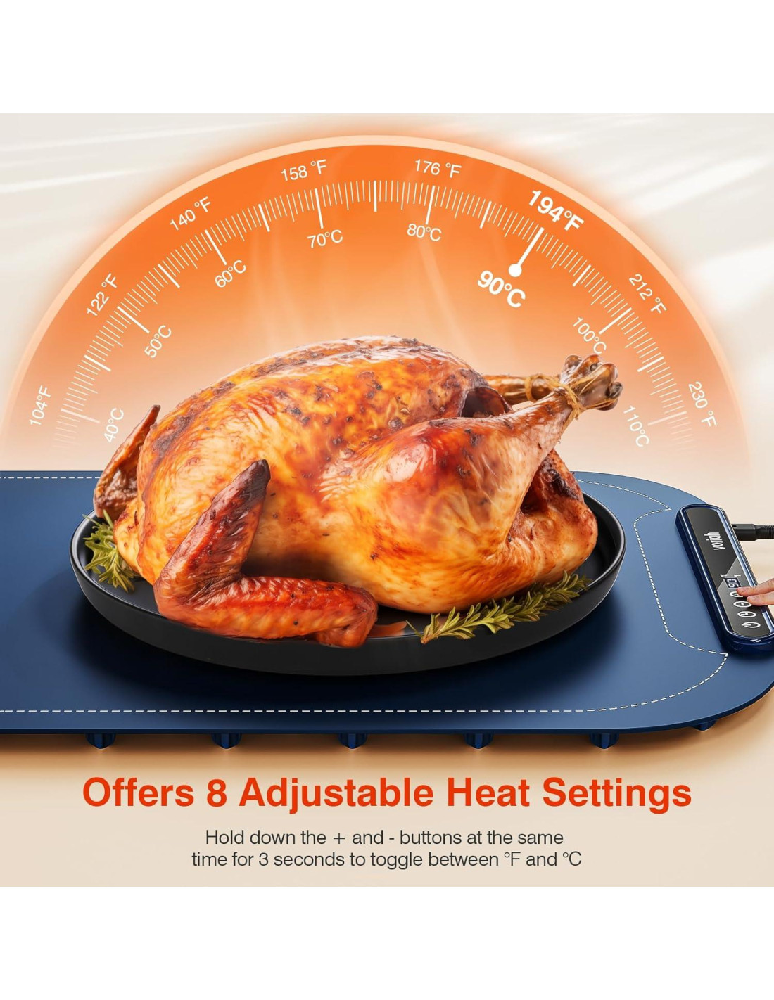 - 8 Niveles de Temperatura Ajustables (40-110C): Disfruta de un calentamiento rápido en solo 10 segundos con 8 configuraciones de temperatura para diferentes alimentos. Ya sea pizza, sopa o guarniciones, esta alfombrilla calentadora eléctrica mantiene todo deliciosamente caliente por más tiempo.