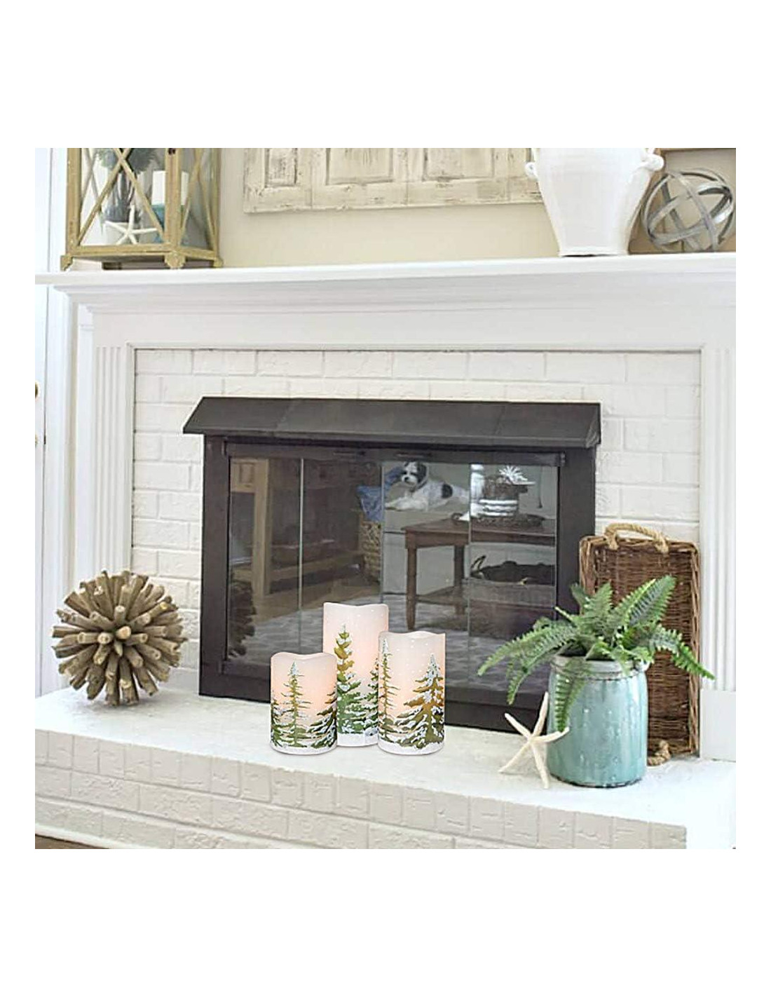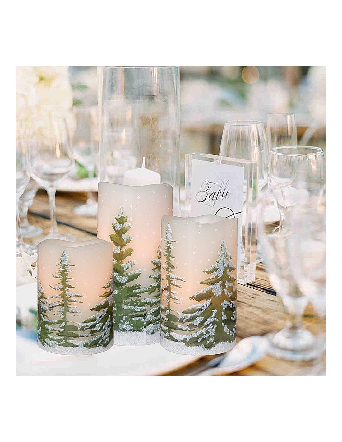 - Especificaciones: Este conjunto de 3 velas de árbol de Navidad tiene alturas de 4 5 6 pulgadas (10.16 12.7 15.24 cm), el diámetro es de 3 pulgadas (7.62 cm), cada una funciona con 3 pilas AAA, que pueden durar más de 200 horas, están hechas de cera real de color blanco con decals de árbol verde.