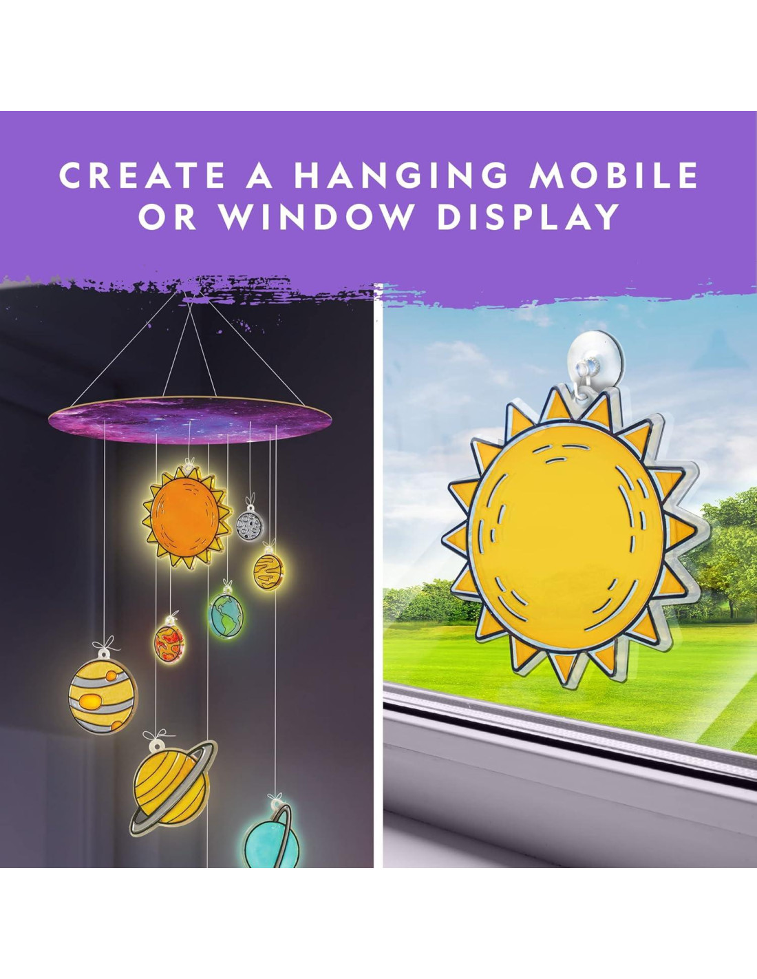 - TODO LO QUE LOS NIÑOS NECESITAN - Este divertido y educativo kit de manualidades contiene un sol y planetas de acrílico, pinturas que brillan en la oscuridad y metálicas, además de ventosas y suministros colgantes para usar como arte de ventana o como un móvil colgante.