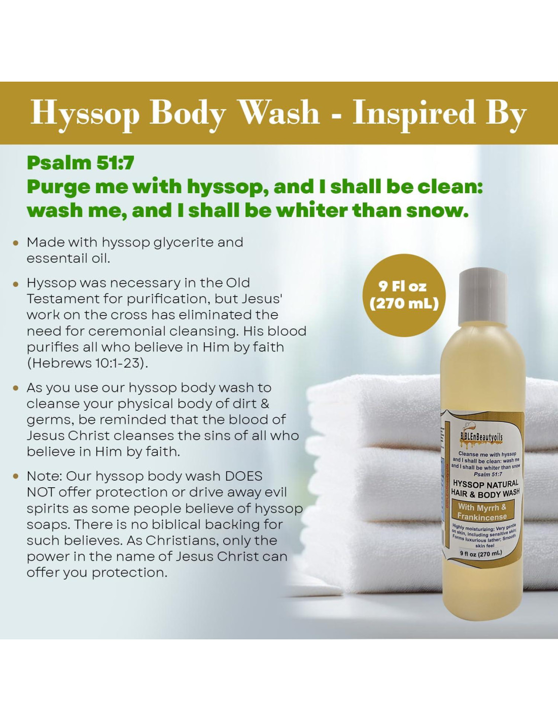 - Significado Espiritual: A medida que limpias tu cuerpo físico con nuestro jabón corporal de hisopo, reflexiona sobre el significado espiritual del hisopo como símbolo de purificación y perdón. Deja que el ritual de limpieza te recuerde el poder purificador de la sangre de Jesucristo.