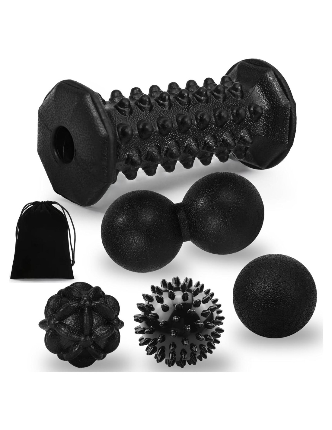 - 1. Juego de 5 en 1 de bola de masaje y rodillo para pies: rodillo de masaje para pies, lacrosse, maní, espinoso, bola de masaje para ejercicio de mano para alivio de fascitis plantar y liberación miofascial. Viene con 5 masajistas diferentes para aliviar el dolor y la incomodidad muscular.