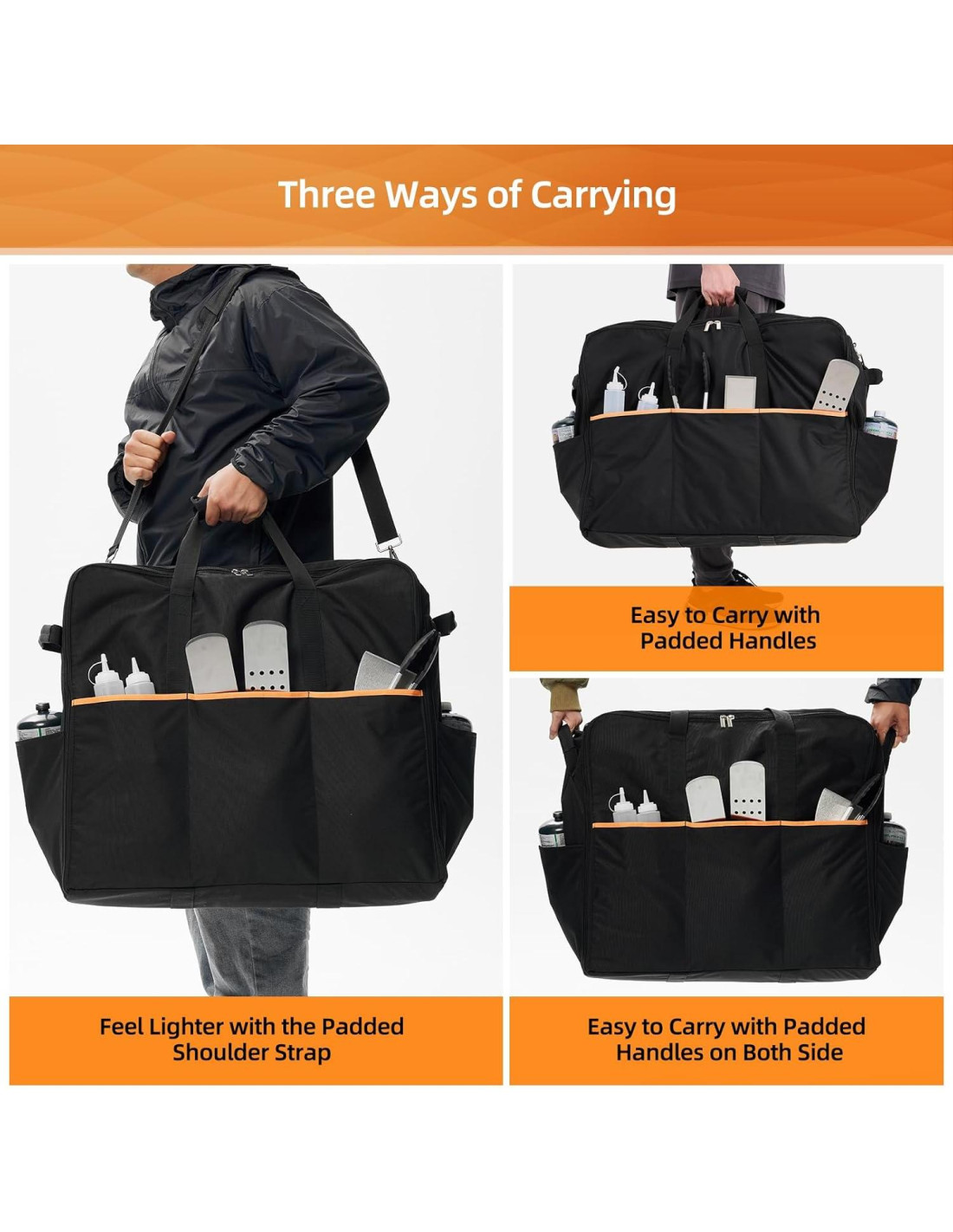 ¡Nuestra bolsa de transporte para parrilla está diseñada para resolver tus problemas! Puedes levantarla fácilmente a través de las correas de hombro o por las asas laterales con tus amigos. El diseño de asa acolchada puede agregar soporte y aliviar el dolor de tus manos. 5 bolsillos de gran capacidad te permiten llevar todas tus herramientas y accesorios de BBQ juntos. Además, el material resistente 600D la hace resistente al agua y al desgaste. Lleva todo lo que necesitas para BBQ junto con la bolsa de transporte Noelife para la plancha Blackstone de 22 pulgadas. Por favor, úsala cuando la parrilla se enfríe. Mantén alejado de calor, superficies calientes, chispas, llamas abiertas y otras fuentes de ignición al usar.