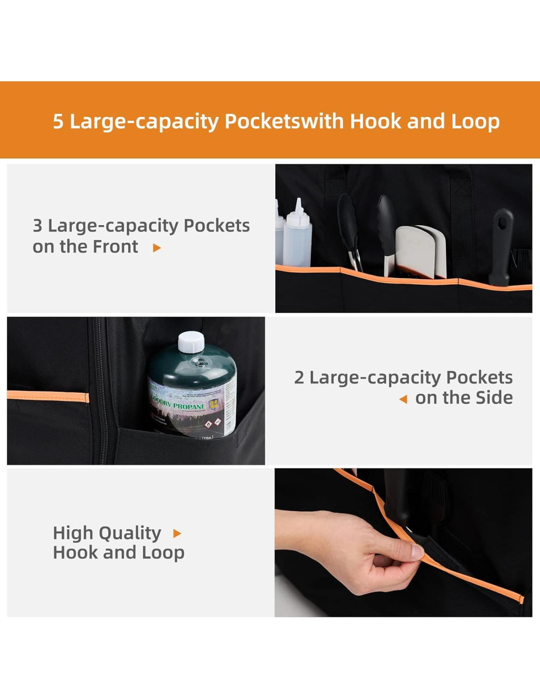 - 5 BOLSILLOS- ¡Lleva todo lo que necesitas en una sola bolsa! Hay 5 bolsillos de gran capacidad con gancho y bucle en la bolsa de transporte de la plancha de 22 pulgadas y 17 pulgadas para Blackstone. 3 en la parte frontal y 2 a cada lado. ¡Te permite llevar todas las herramientas, condimentos y otros accesorios que necesitas juntos!