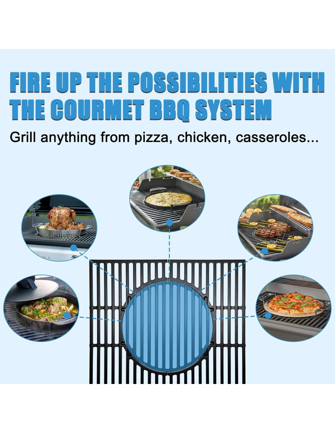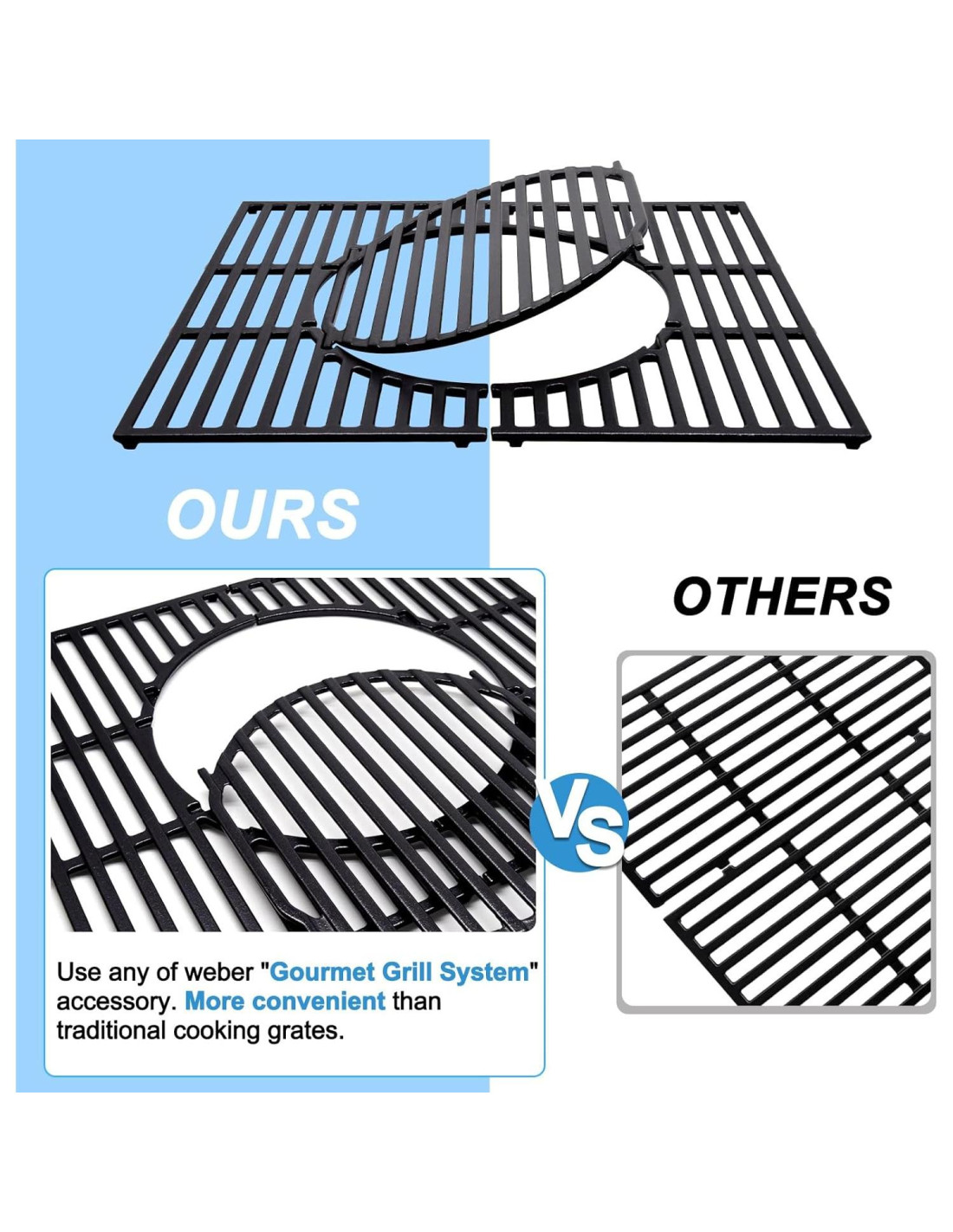 - [7637 Rejillas de Parrilla] -Dimensión: Dimensiones totales son 17 1/2" X 20 1/2" (44.45 cm x 52.07 cm), Rejilla Lateral Izquierda y Derecha: 17 1/2" x 10 1/4" (44.45 cm x 26.04 cm). -Material: Hierro Fundido de Alta Resistencia. -Fácil de quitar: Puedes quitar la rejilla central GBS Insert para usar cualquiera de los accesorios del "Sistema de Parrilla Gourmet" de Weber. Esta rejilla weber spirit ii e-210 está hecha de hierro fundido para asegurar un uso duradero; Más pesada y sólida que otras; No se astilla ni se oxida como las rejillas esmaltadas.