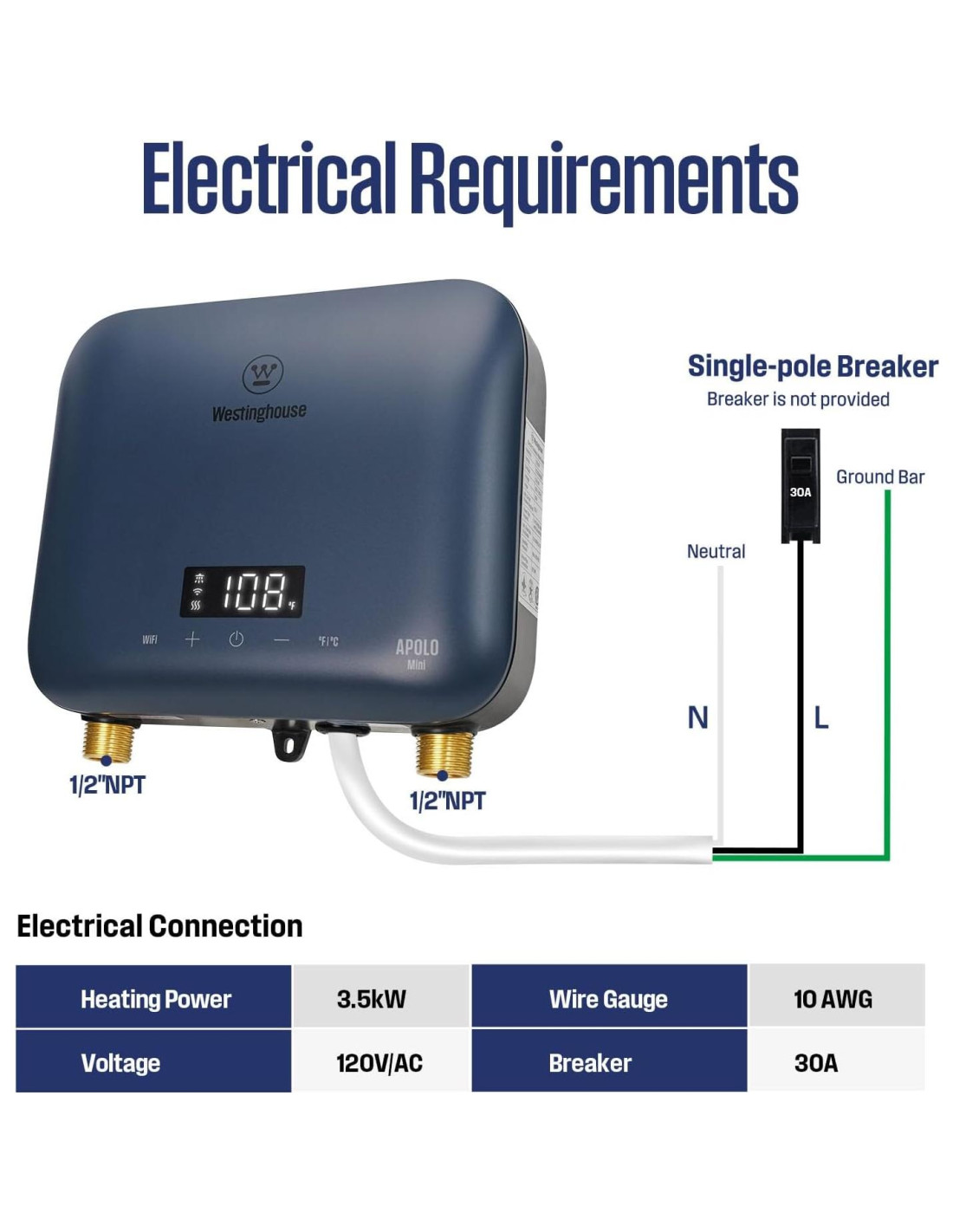 - Se adapta a espacios reducidos (17.5cm x 20.6cm x 6.4cm) con conexiones NPT de 1/2 pulgada. ¡Requiere solo un circuito dedicado de 30A, instalación amigable para el usuario!