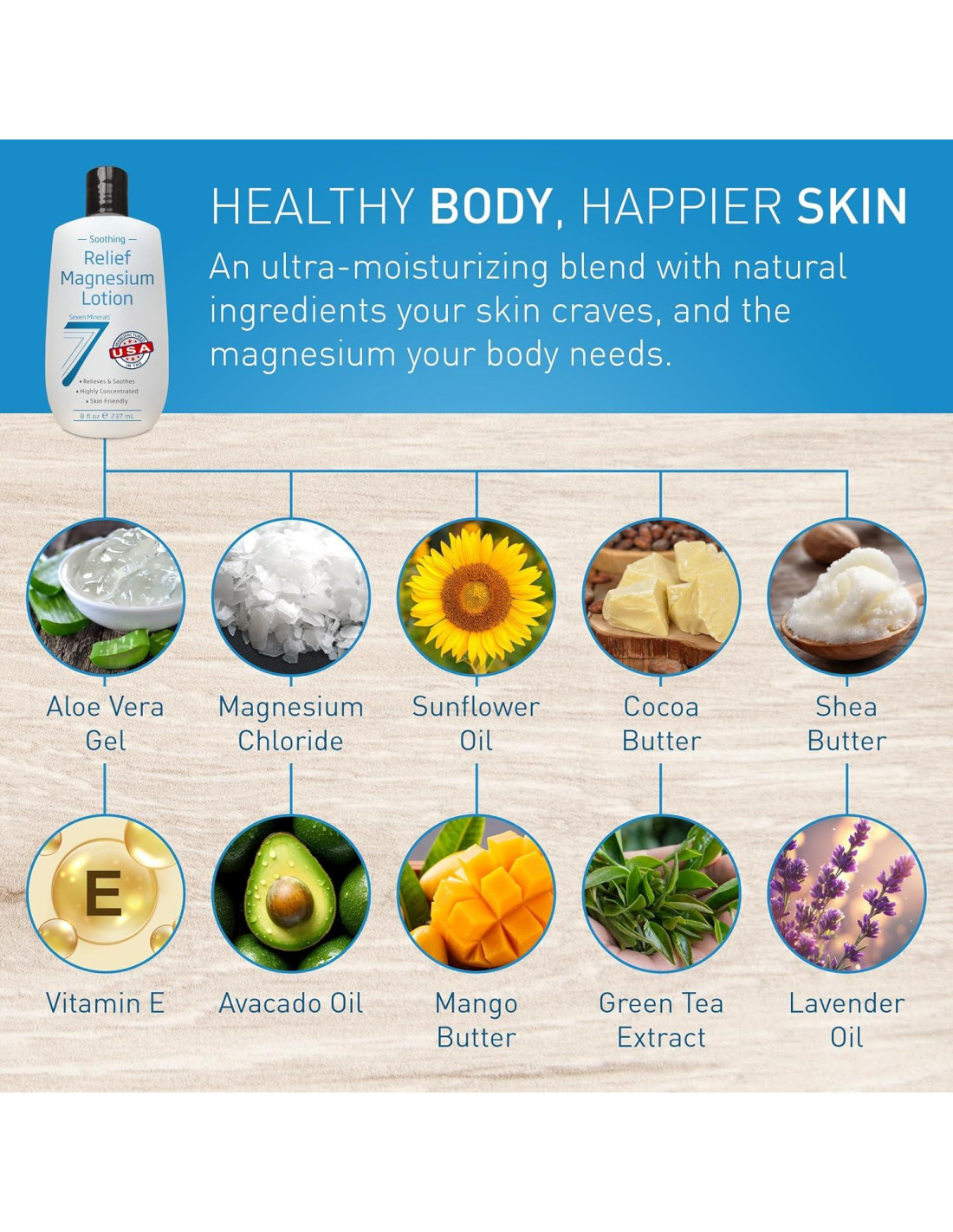 - MAGNESIO DE LA MÁS ALTA CALIDAD, RESULTADOS DE LA MÁS ALTA CALIDAD - Disfruta de una hidratación profunda con nuestra lujosa mezcla de ingredientes como Manteca de Karité, Aceite de Coco, Manteca de Aguacate, Manteca de Mango, Vitamina E y mucho más. Esta rica loción va más allá del alivio, mimando tu piel con cada uso y asegurando una sensación suave e hidratada que dura.