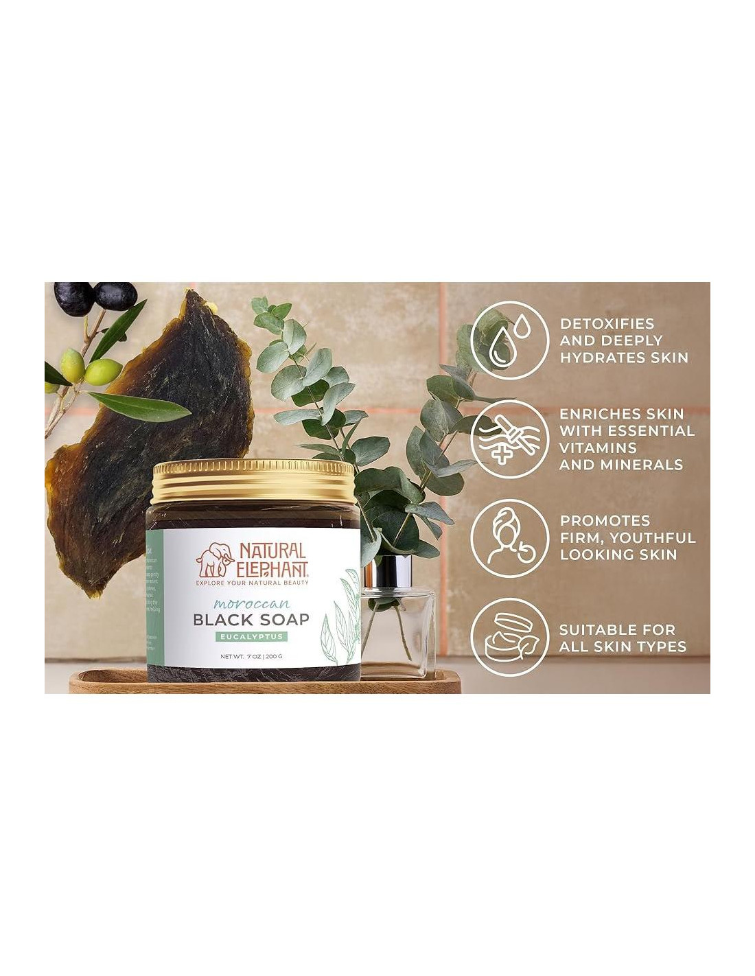 - Cuidado de la Piel Versátil: Adecuado para todo tipo de piel, el Jabón Negro Marroquí de Natural Elephant con Eucalipto es perfecto tanto para el cuidado del rostro como del cuerpo, ofreciendo una experiencia lujosa para tu rutina diaria.