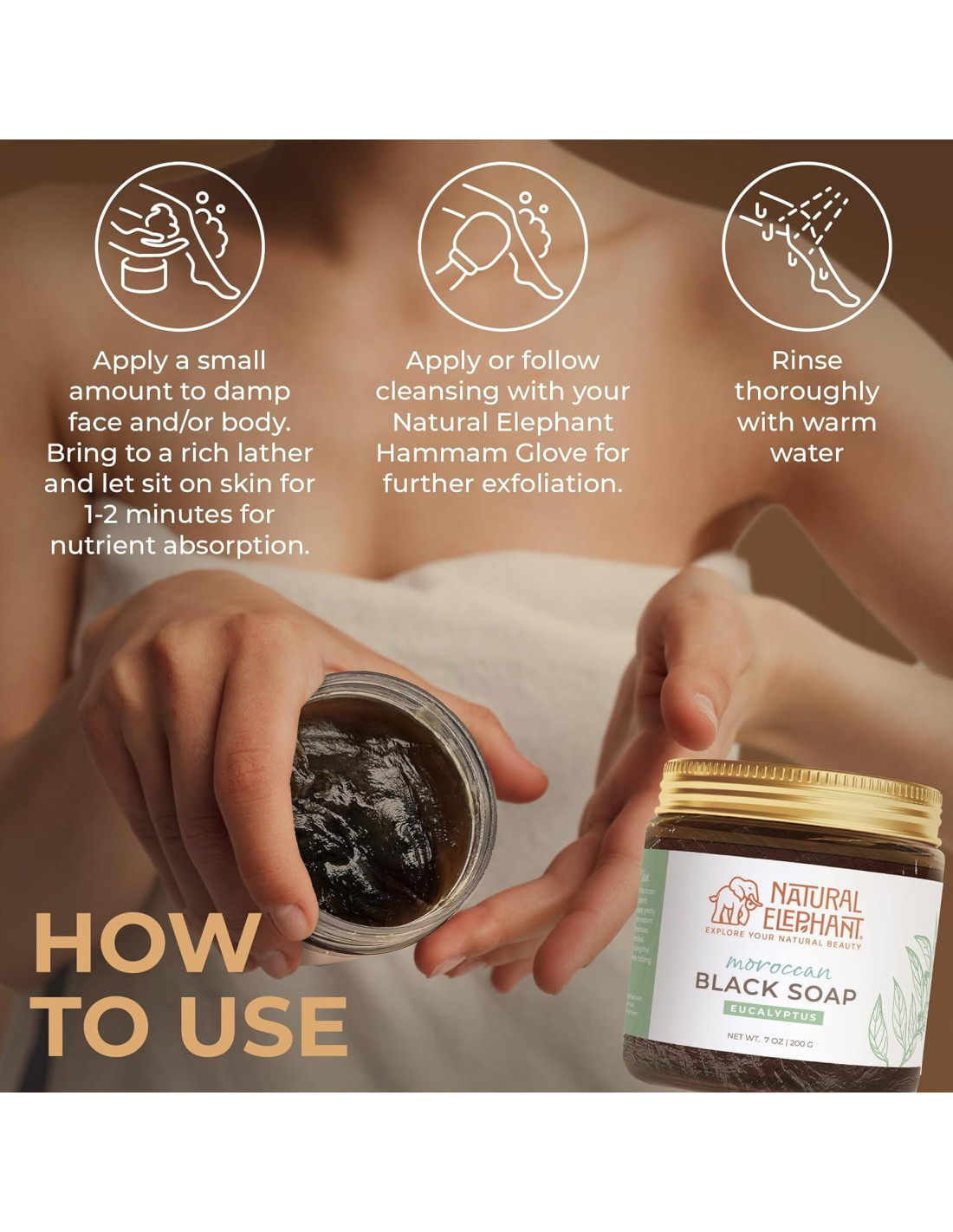 - Uso Simple y Efectivo: Para obtener los mejores resultados, aplica sobre la piel humedecida y deja que el jabón repose durante 1-2 minutos antes de enjuagar bien con agua tibia. Combina con el Guante Hammam de Natural Elephant para una exfoliación mejorada y una experiencia de spa en casa.