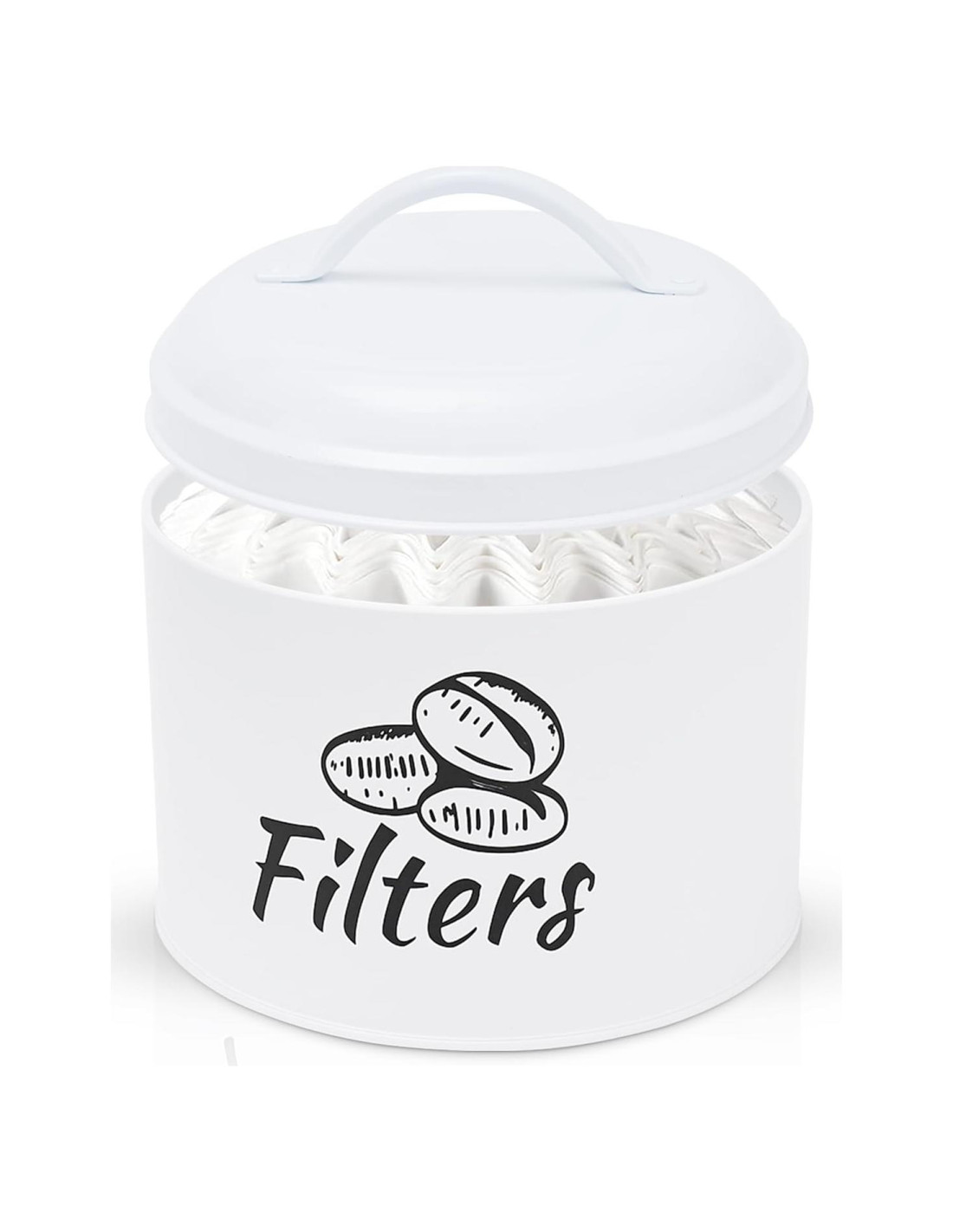 - Tapa de Metal Elegante para Protección contra el Polvo La tapa de tono plateado está diseñada para sellar la humedad y el polvo, manteniendo tus filtros de papel secos y frescos. Su duradera manija permite un fácil acceso en cualquier momento del día.