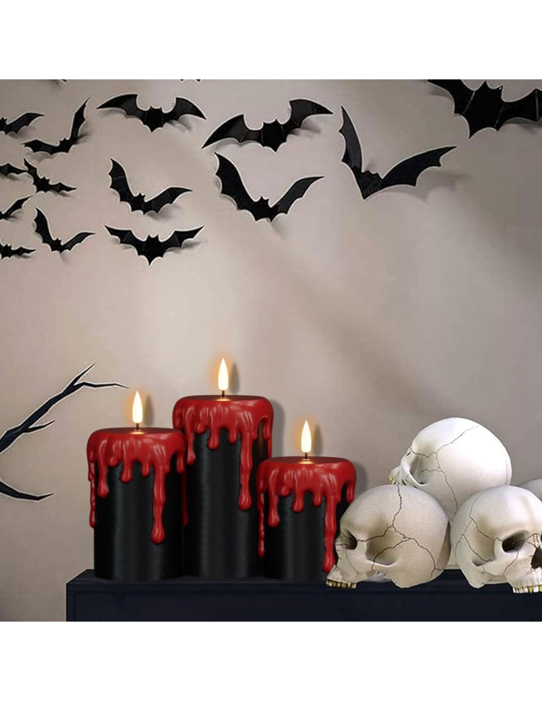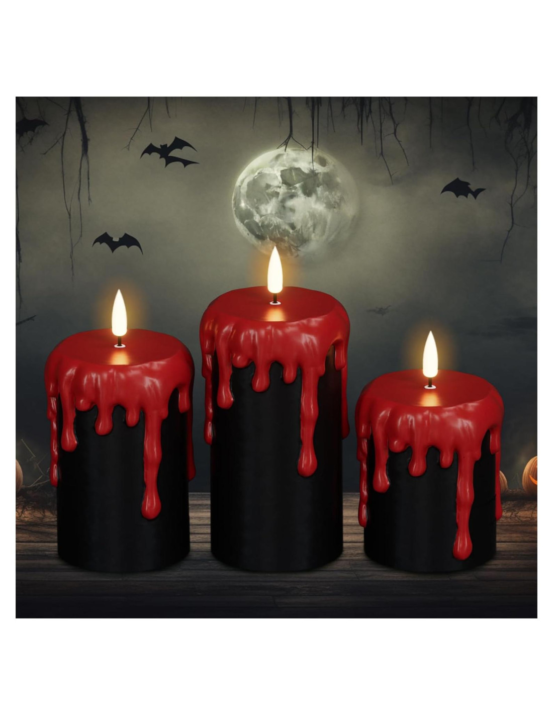 - [Qué hay en la caja]: Cada juego de velas negras sin llama de Halloween incluye 3 velas de 7.5 cm con alturas de 10 cm, 12.5 cm, 15 cm, un manual de usuario. Ampliamente utilizado como centro de mesa para la decoración de Halloween.