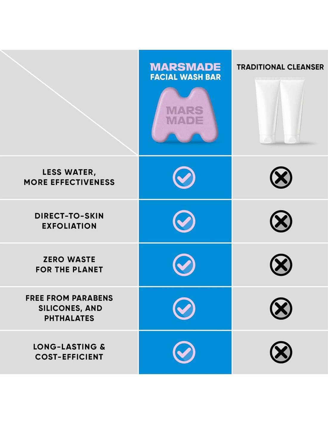 - HECHO CON PENSAMIENTO PARA TU PIEL. La misión consciente de MARSMADE se extiende a su empaque. Esta barra de limpieza facial vegana está hecha sin pruebas en animales, sulfatos, parabenos ni fragancias artificiales. Empaquetada en papel FSC con tinta de soya y un envoltorio que se descompone con el tiempo, ¡es un pequeño producto con un gran corazón!