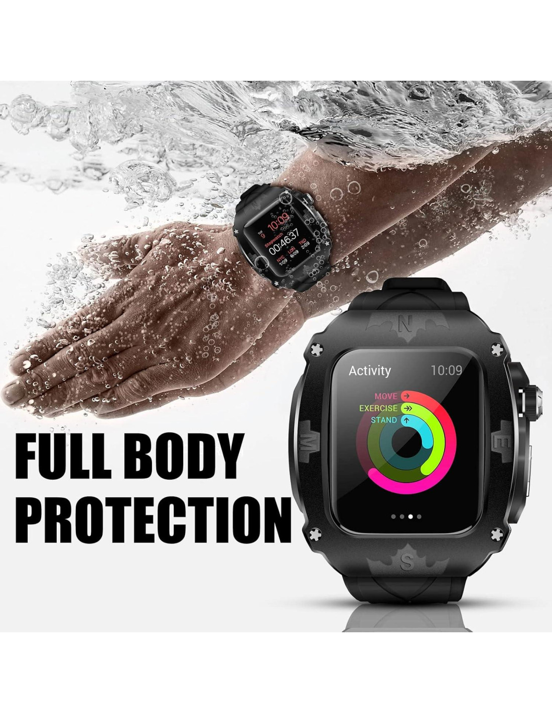- [Material] Funda: funda de metal, resistente a los arañazos y duradera. Forro: cubierta protectora de silicona independiente incorporada (44/45mm) como capa de amortiguación, anti-desgaste, anti-caída y a prueba de golpes. Correa: material de goma de alta calidad, ecológico, amigable con la piel y a prueba de polvo, rendimiento estable, fácil de limpiar.