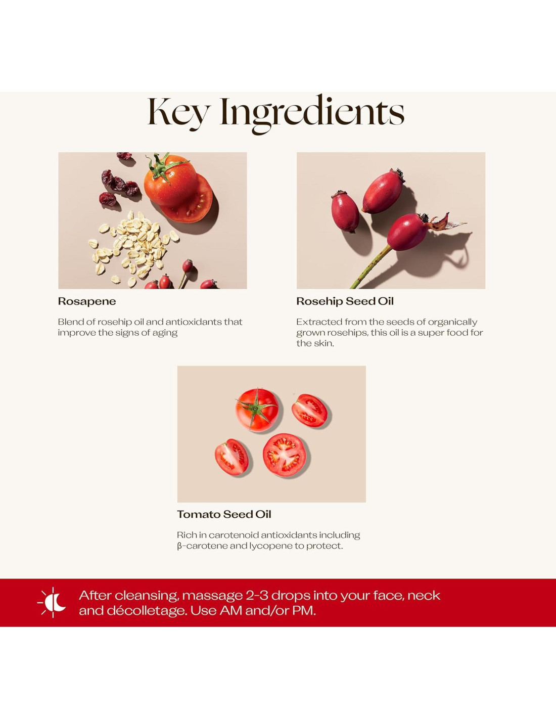 - Mezcla Avanzada de Rosapene: Nutre con una mezcla de aceites de rosa mosqueta, arándano, semilla de tomate y acai para mejorar la elasticidad y el brillo