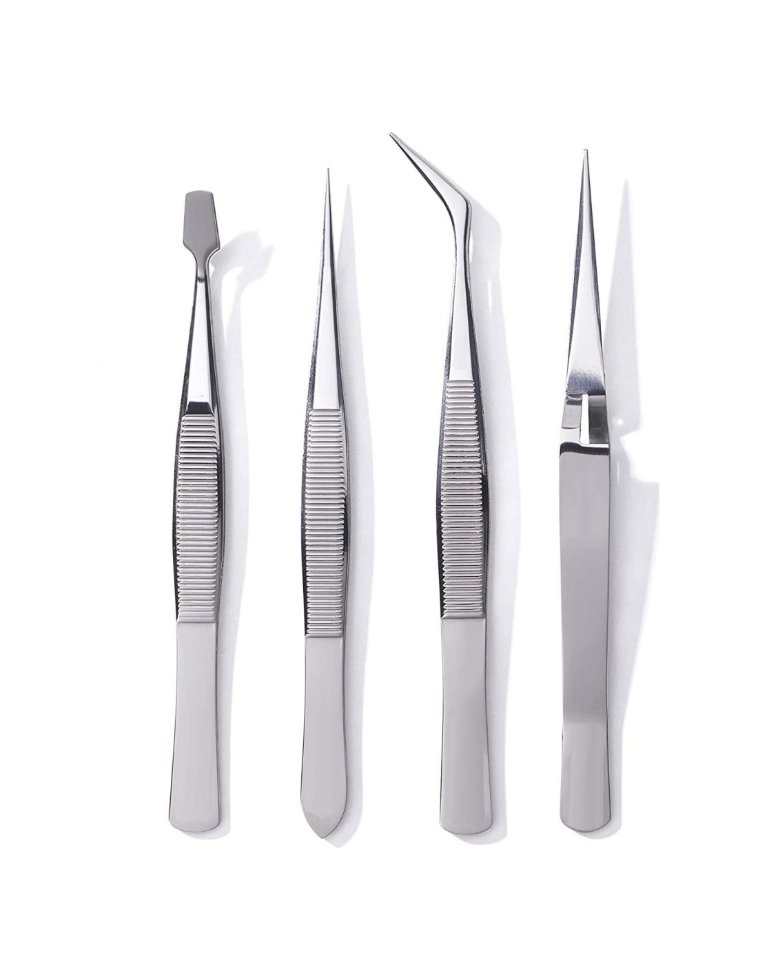 - El conjunto de 4 piezas incluye pinzas de punta inclinada, pinzas de punta de puntero, pinzas redondas y pinzas de acción inversa
