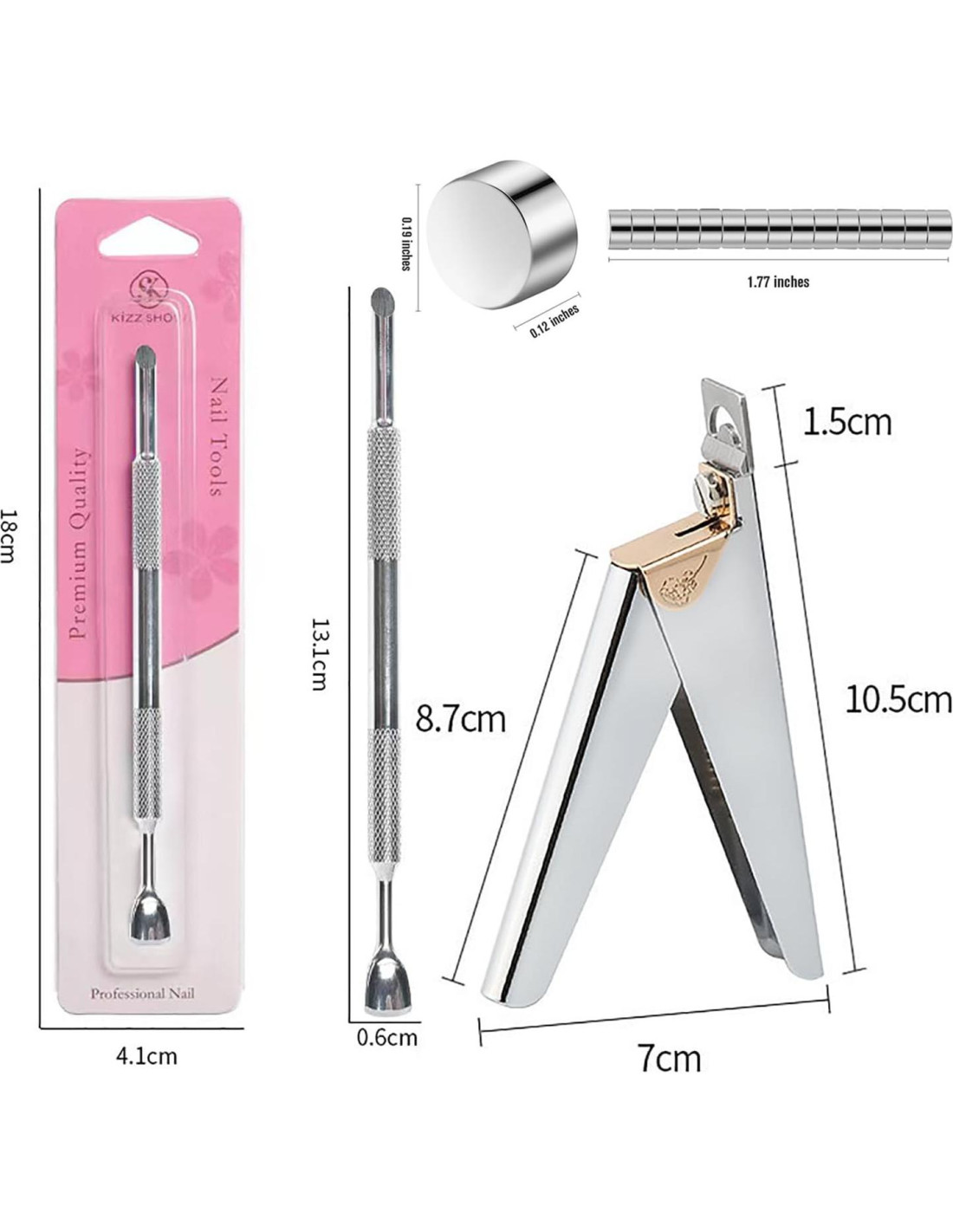 ESPECIFICACIÓN - Color: Plata Contenido del paquete: - 1 x 1 cortador de uñas - 1 x 15 imanes potentes - 1 x 1 empujador de cutículas