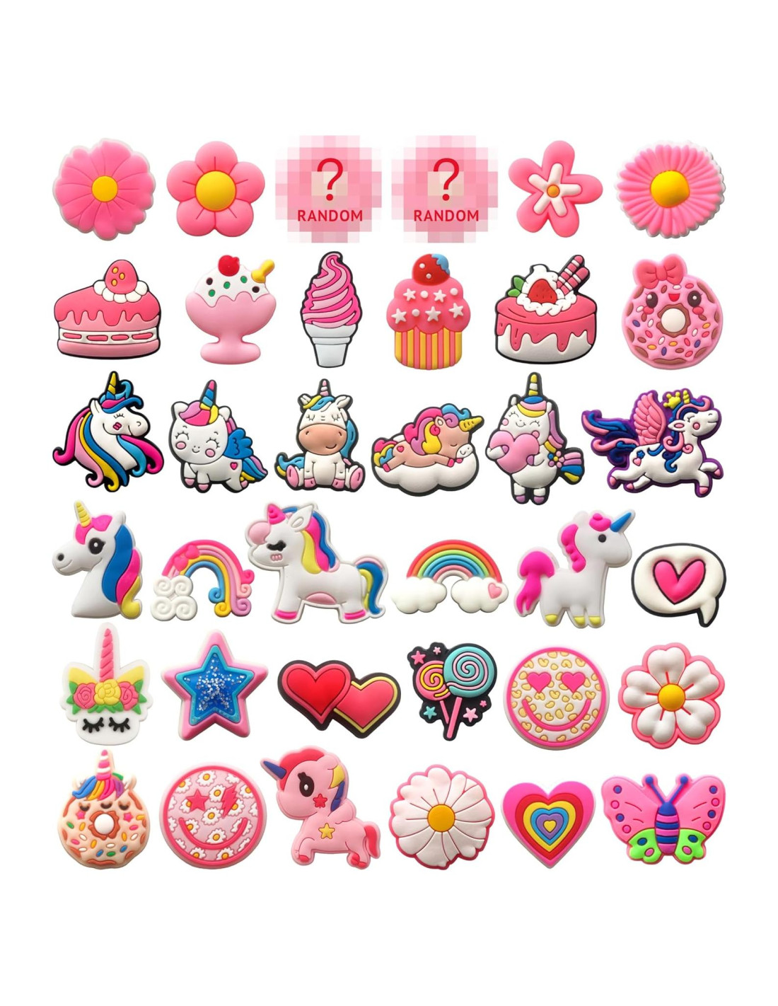 - [ENCANTOS DE ZAPATOS para NIÑAS] Esta colección presenta 36 encantos únicos e increíblemente, como flor rosa, unicornio, comida, helado, pastel, dona, piruleta, arcoíris, mariposa, amor, encantos de zapatos para niñas, niños y mujeres. Cada encanto añade un toque juguetón a tu calzado, mostrando el diseño icónico.