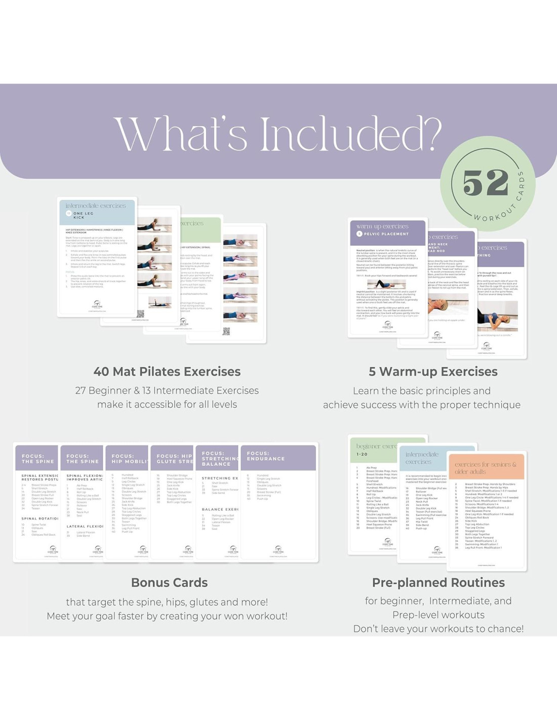 - TARJETAS DE PILATES EN COLCHONETA PARA MUJERES: Transforma tu rutina de ejercicios con nuestras Tarjetas de Ejercicio de Pilates, un kit esencial de Pilates completo para mujeres que presenta una variedad de ejercicios para mejorar tu experiencia de entrenamiento en casa.