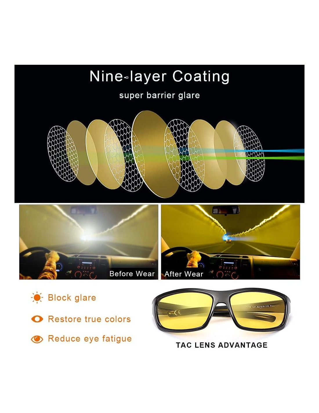 - GAFAS NOCTURNAS PARA CONDUCCIÓN: Los lentes amarillos de las gafas de conducción POLARKING para visión nocturna pueden reducir el deslumbramiento de los faros de los coches que vienen o reflejos agudos. Las gafas deportivas con tinte amarillo están diseñadas para reducir el brillo de la luz blanca. Las gafas de sol con lentes amarillos pueden mejorar el contraste y proporcionar una visión más precisa al conducir de noche o en días nublados, brumosos o lluviosos, haciendo que la conducción sea más segura. Las gafas deportivas para visión nocturna también son adecuadas para correr, andar en bicicleta o montar.