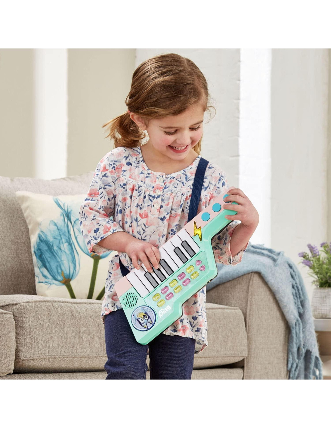 - Crea tu propia música romántica usando una réplica del keytar de Bluey del programa o toca junto a 10 melodías incorporadas, incluyendo la canción principal de Bluey