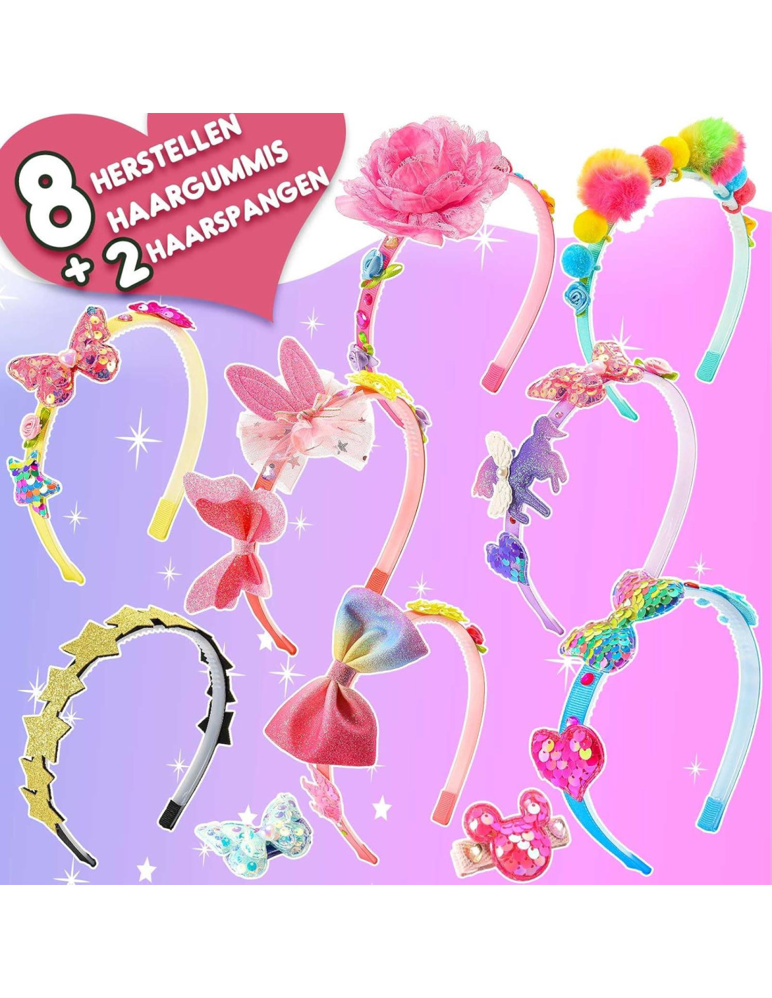 - Componentes incluidos: 8 diademas anchas, 2 clips para el cabello, 1 lazo grande, 1 unicornio, 1 flor grande, 10 flores pequeñas, 2 estrellas brillantes, 2 corazones brillantes, 2 coronas, 2 Mickeys brillantes, 1 cinta de brillo en forma de estrella, 2 lazos brillantes, 2 mariposas brillantes, 1 mariposa brillante, 1 pegatina de diamante brillante, 6 pompones pequeños, 2 pompones grandes, 1 orejas de conejo de malla, y 2 piezas de pegamento