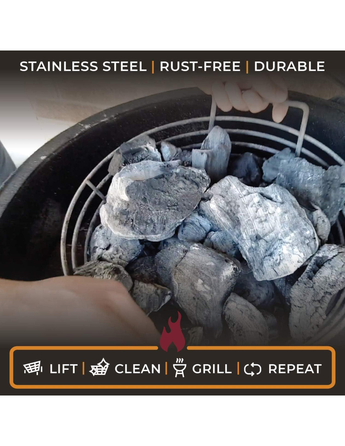 - Proporciona a tus carbones y carbón natural el espacio que necesitan para respirar; los mejores fuegos para parrillas y ahumadores se hacen cuando los carbones no están sofocados por la ceniza sobrante; la tecnología utilizada en los diseños originales de Kick Ash Basket asegura que tus carbones estén aireados y limpios de escombros cada vez que enciendes para cocinar; todo lo que tienes que hacer es agitar esa ceniza