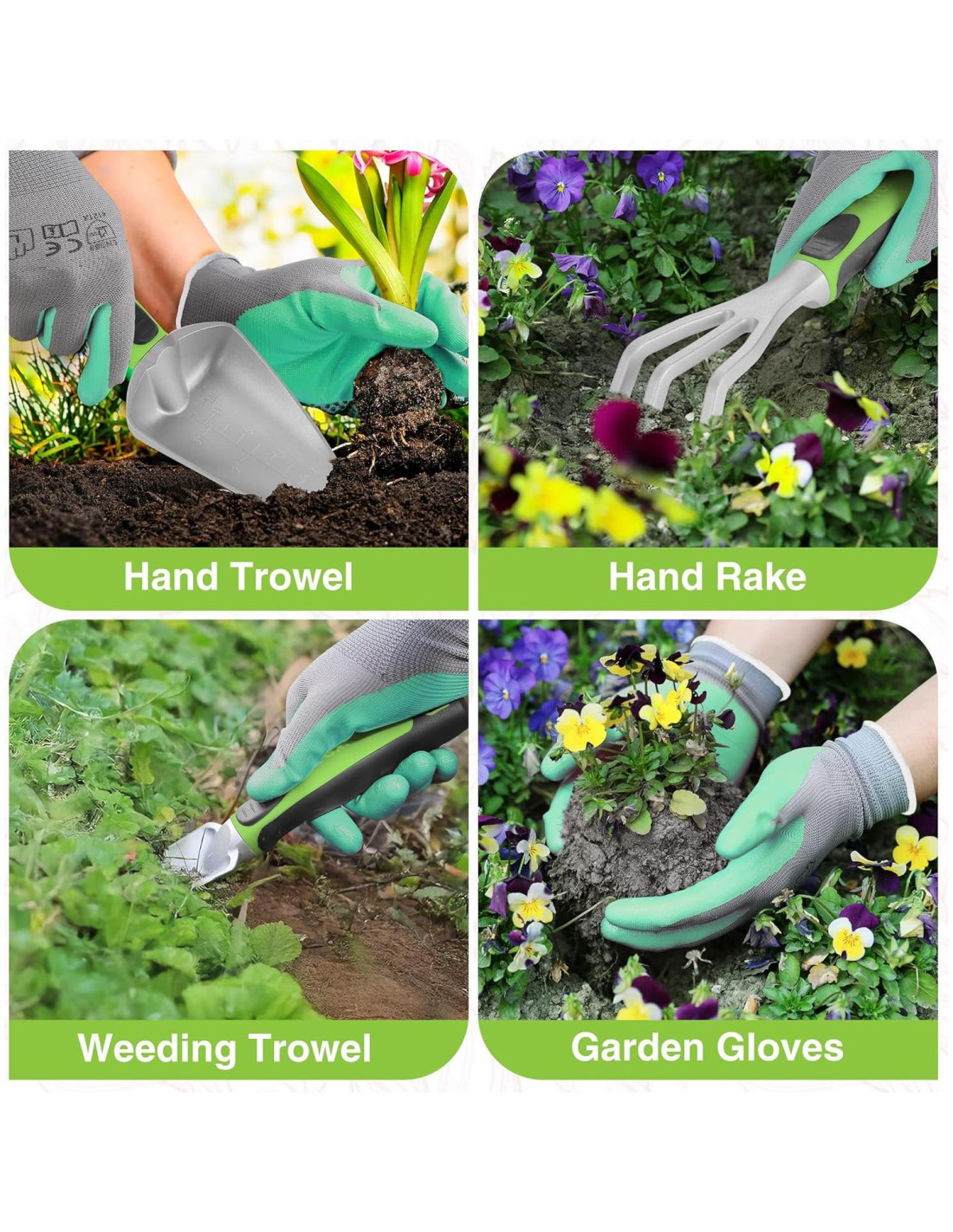 - Protección de Manos Considerada: Incluye guantes de jardinería recubiertos de nitrilo que se ajustan perfectamente y ofrecen una protección superior. Estos guantes previenen eficazmente rasguños y suciedad mientras aseguran un excelente agarre y destreza en los dedos, haciendo que el manejo de herramientas sea más suave y eficiente.