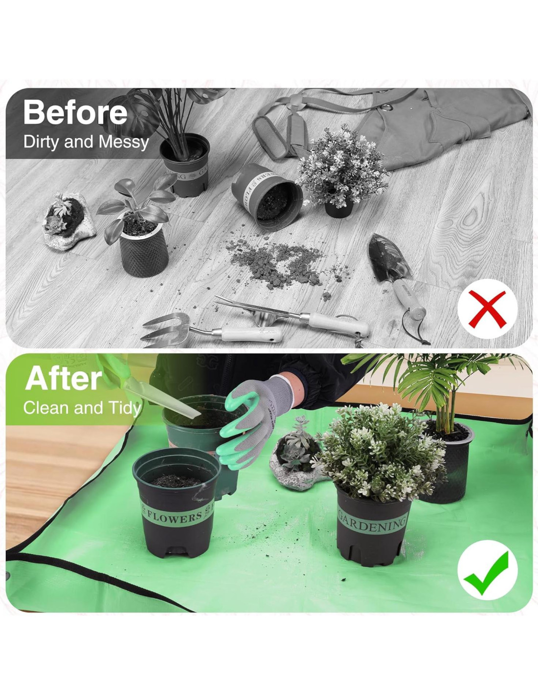 - Asistente de Jardinería Limpio y Eficiente: Equipado con una alfombrilla de replantado de plantas gruesa e impermeable que cuenta con hebillas de cobre en las esquinas para evitar que el agua y la tierra se derramen. Ya sea trabajando en interiores o exteriores, mantiene tu espacio de trabajo ordenado, eliminando la molestia de limpiar la tierra esparcida.