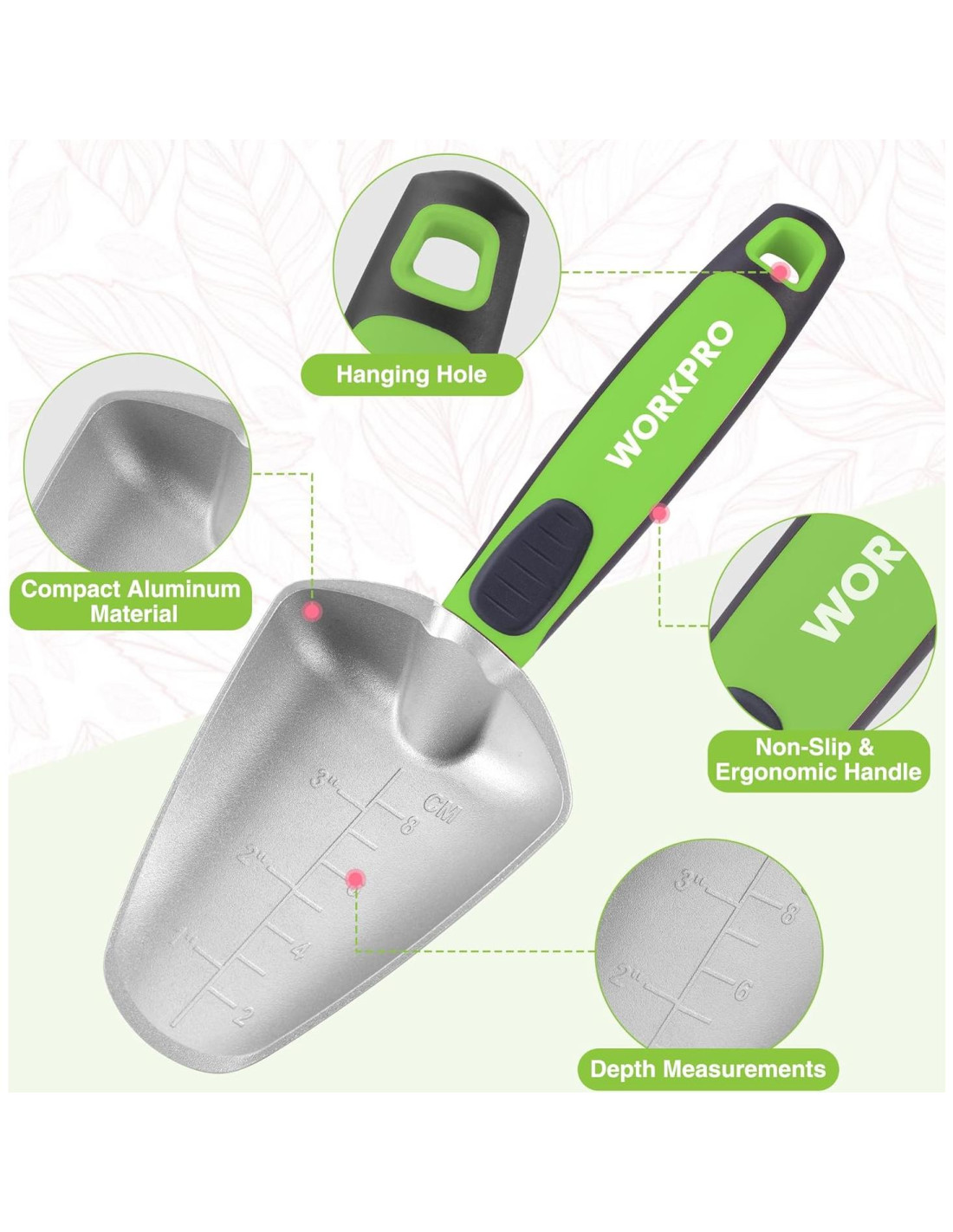 - Juego de Herramientas de Jardín de 5 Piezas: El Juego de Herramientas de Jardín WORKPRO incluye una paleta de mano, un rastrillo de mano, una paleta de deshierbe, una alfombrilla impermeable para trasplante de plantas y un par de guantes de jardinería duraderos. Diseñado para plantar, cavar, aflojar tierra y trasplantar, este conjunto satisface todas tus necesidades de jardinería, brindándote una experiencia de jardinería más cómoda y placentera.