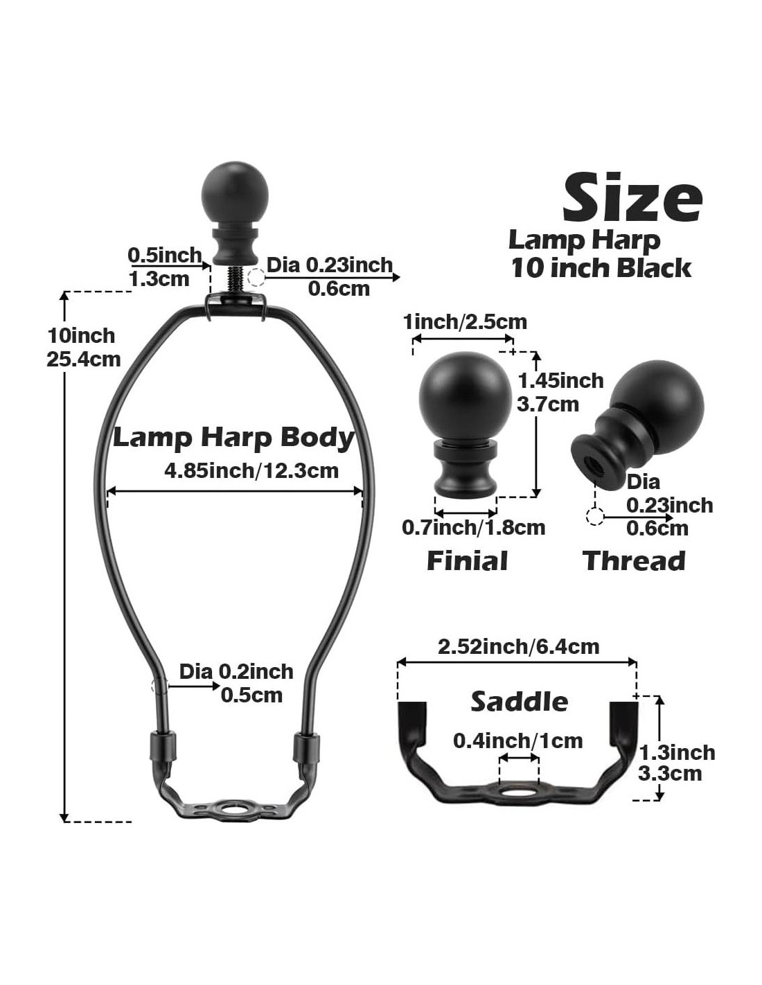 - Especificación - Juego de 2. Color negro. La altura del soporte de lámpara es de 10 pulgadas / 25.4 cm (desde la parte inferior del tenedor hasta la parte superior del hombro) y el ancho es de 4.85 pulgadas / 12.3 cm. El ancho de la silla es de 2.52 pulgadas (6.4 cm) y el diámetro del agujero es de 0.4 pulgadas (1 cm). El diámetro del remate de la lámpara es de 1 pulgada (2.5 cm) y la altura es de 1.45 pulgadas (3.7 cm), con rosca estándar de 0.23 pulgadas (0.6 cm). Nota: antes de comprar, asegúrese de que el tamaño sea el correcto para su lámpara.