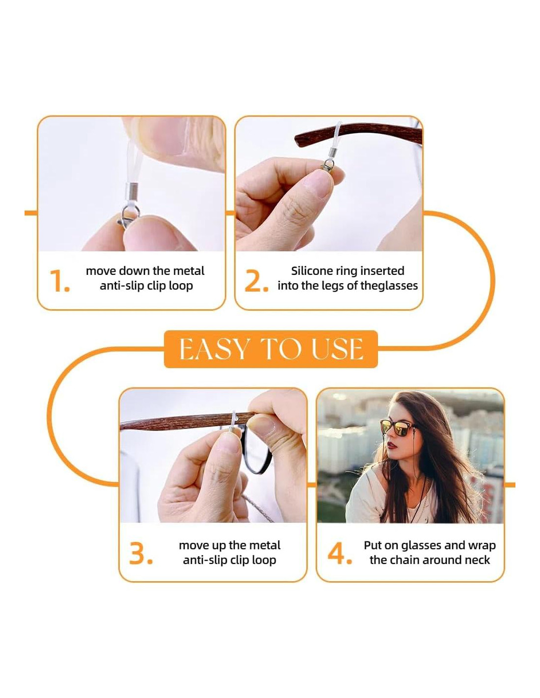 - Fácil de usar: La cadena de gafas está diseñada a una longitud cómoda de aproximadamente 29 pulgadas (73,66 cm), cada cordón de gafas incluye un par de bucles de silicona ajustables mejorados. El clip de metal antideslizante asegura y estabiliza la cadena de gafas en tus gafas, previniendo caídas no intencionadas, es adecuado para que todos lo usen