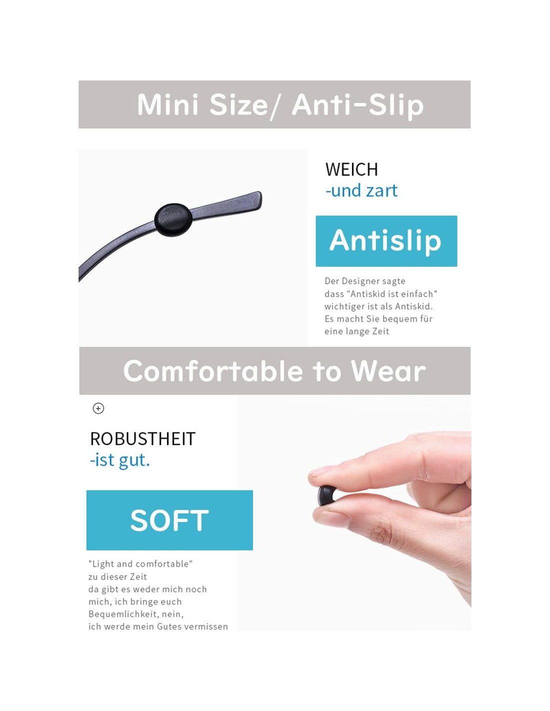 - Diseño Antideslizante: Los agarres para orejas aseguran un ajuste perfecto para evitar que tus gafas se deslicen y son fáciles de aplicar a tus gafas (de sol), y no sientes molestias en las orejas.