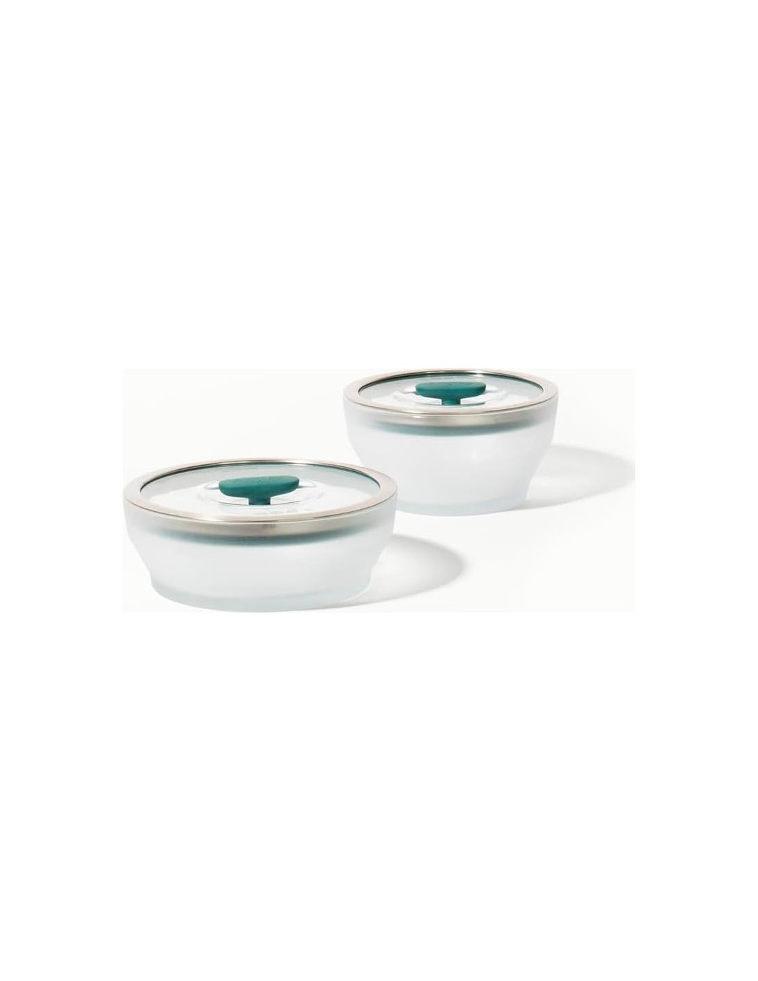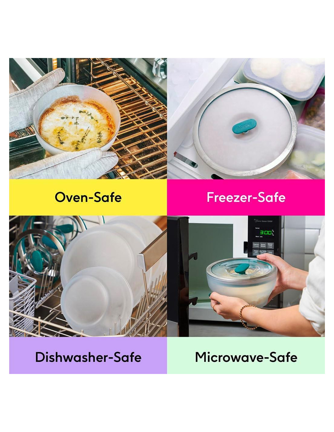 - Tapas de Vidrio con Bisel de Silicona: Nuestras tapas herméticas y que bloquean salpicaduras cuentan con un bisel de silicona que atrapa el vapor y mantiene la comida húmeda, además de un pomo de silicona que ventila el exceso de vapor; Presiona el pomo hacia abajo para apilar y almacenar ordenadamente estos contenedores de almacenamiento de vidrio