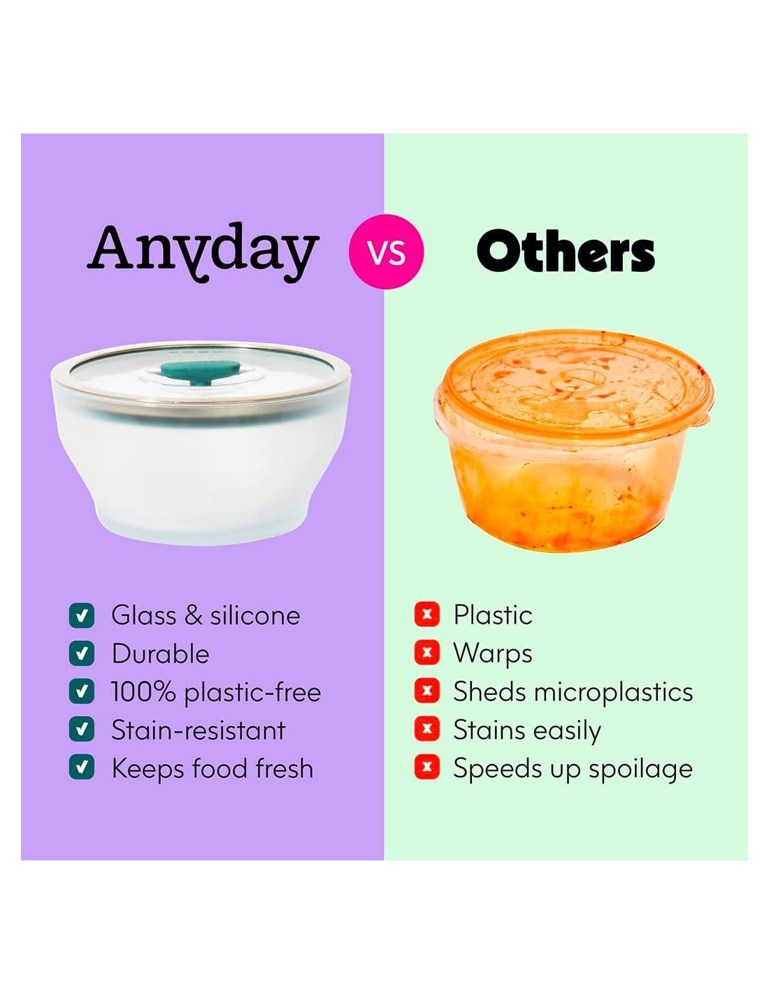 - El Plato que Lo Hace Todo: Hecho de vidrio borosilicato resistente y esmerilado, los contenedores de almacenamiento de alimentos Anyday con tapas facilitan disfrutar de comidas húmedas y cocidas de manera uniforme directamente del microondas sin preocuparse por deformaciones o microplásticos