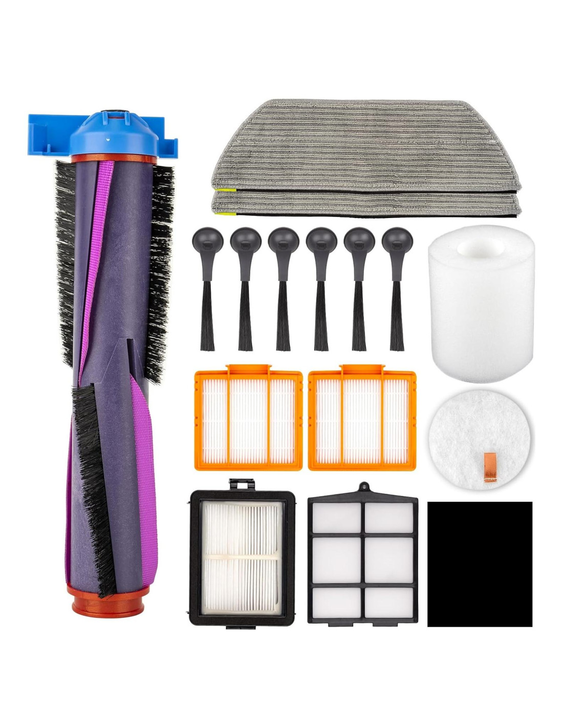 - Tipo de material: Kit de accesorios: 15 piezas incluidas: 1 cepillo rodante, 3 filtros HEPA, 1 pre-filtro, 2 filtros de espuma, 6 cepillos laterales, 2 paños de mopa