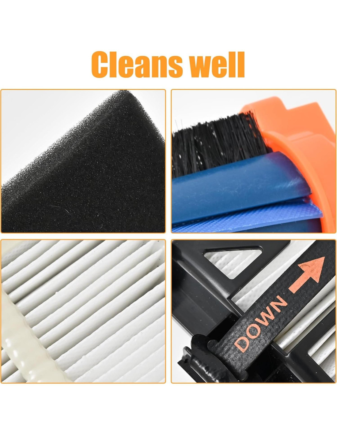 - Componentes Incluidos: 1 Paquete Cepillo Principal + 1 Filtro & 2 Filtros de Espuma y Fieltro Pre-Motor + 2 Paquetes de Filtro Previo + 4 Paquetes de Filtros + 8 Paquetes de Cepillos Laterales + 1 Paquete de Herramienta de Limpieza