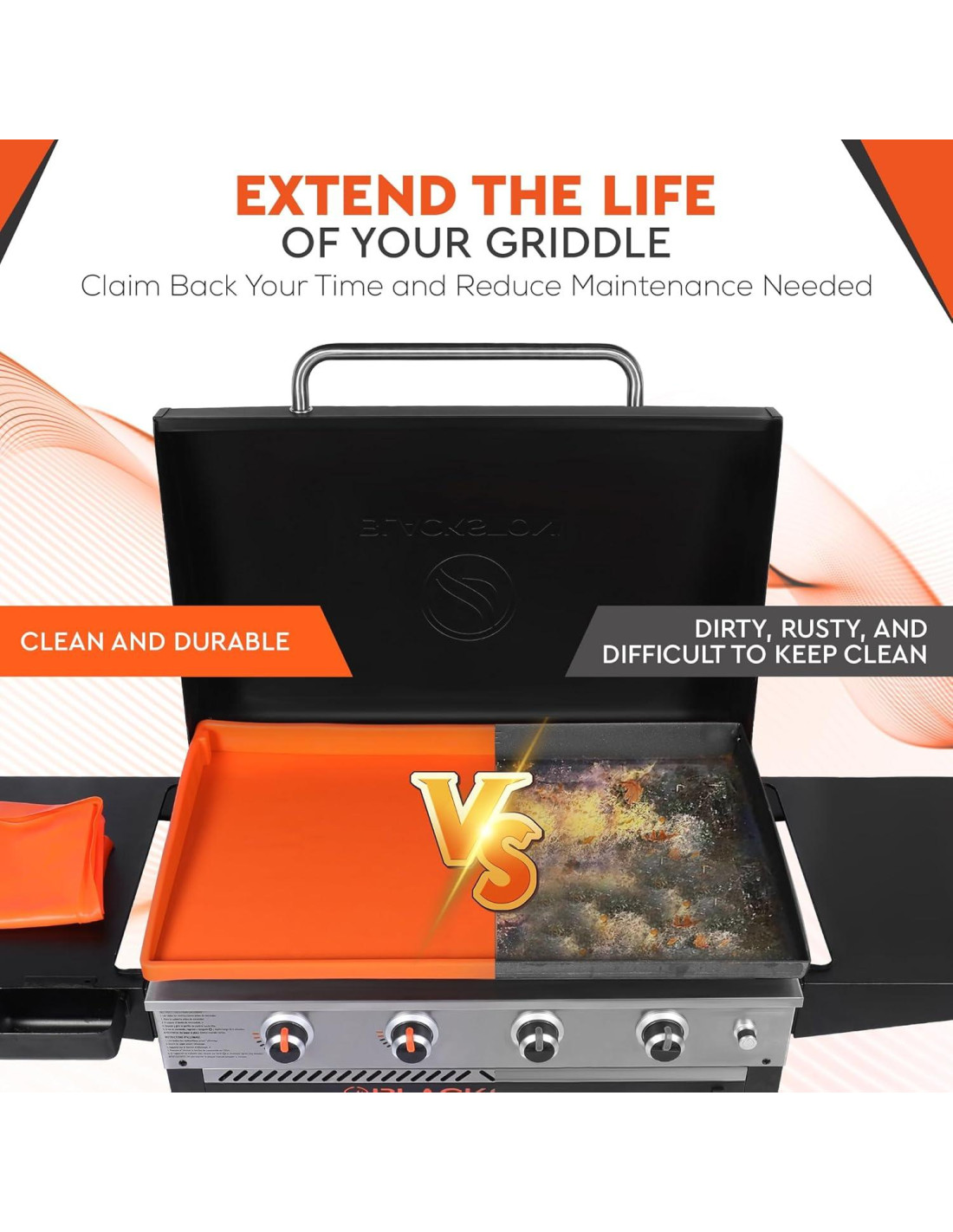 - Sin preocupaciones en días lluviosos: Diseñada específicamente, nuestra cubierta de plancha Blackstone de 91.44 cm se ajusta perfectamente, extendiéndose sobre los bordes para prevenir la intrusión de lluvia, por lo que tu parrilla se mantiene seca y protegida. Un imprescindible para cualquier parrillero serio que enfrenta los elementos. Nuestra alfombrilla de parrilla de silicona de grado alimenticio y libre de BPA garantiza una experiencia de parrilla segura y libre de toxinas, y la flexibilidad de la alfombrilla permite que se pliegue de manera ordenada.