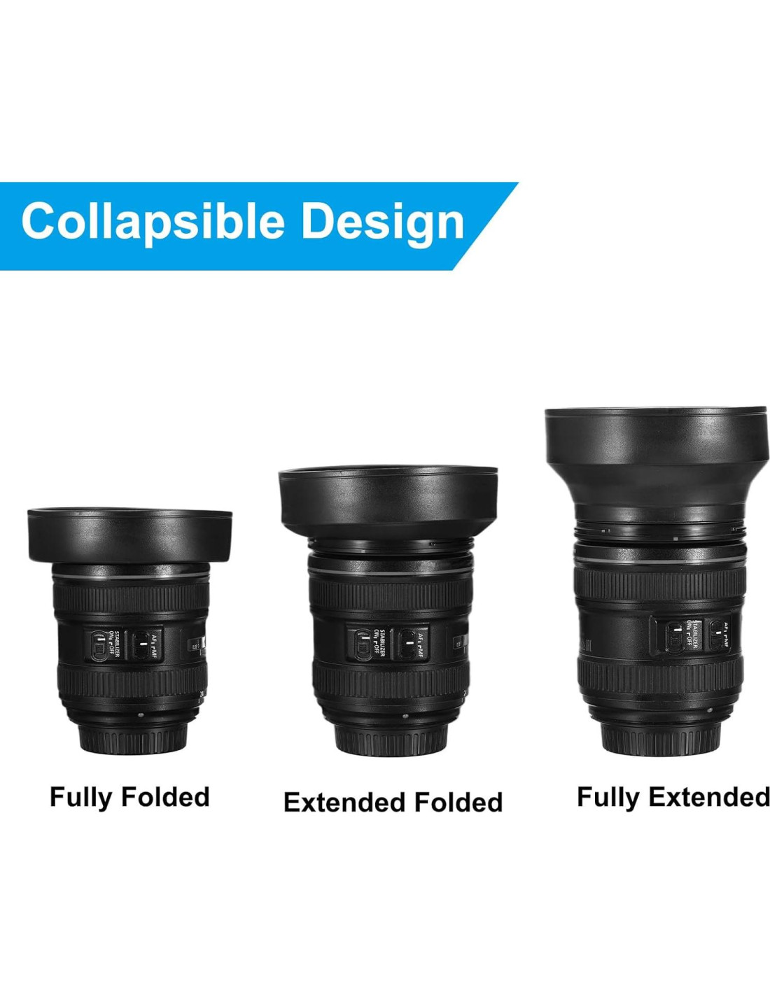 - Hecho de material de goma que es duradero y de larga duración. La conexión entre el capucho de lente y la lente es un aro de metal, asegurando un ajuste apretado y seguro. Con un diseño colapsable, tiene 3 estados ajustables diferentes para adaptarse a lentes de enfoque largo, lentes estándar y lentes gran angulares. Presenta un diseño interno anti-reflectante que previene que la luz entre en la lente durante la fotografía en condiciones de poca luz. También protege la lente de daños accidentales y evita que los dedos toquen la superficie de la lente.