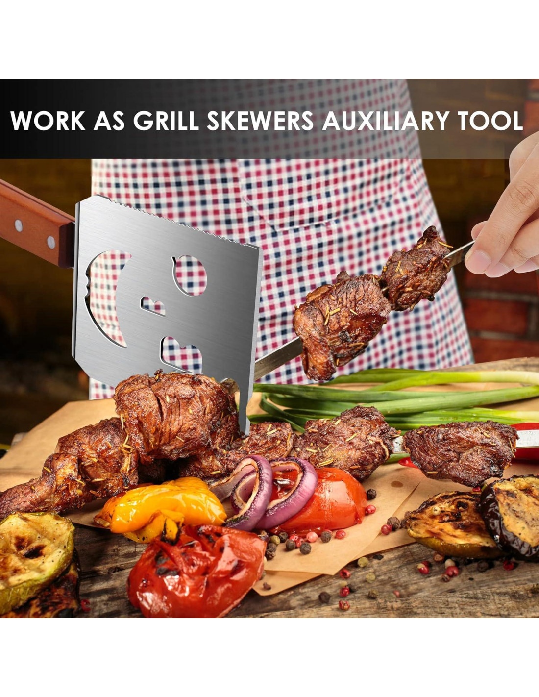 - HERRAMIENTA DE PARRILLA PARA MASTERS DE BBQ. La espátula para parrilla con raspador tiene múltiples funciones del conjunto de herramientas de barbacoa: espátula, voltear la salchicha a la parrilla, cuchillo de parrilla, abridor de botellas, herramienta auxiliar para pinchos de parrilla, raspador de BBQ, elevador de rejilla de parrilla, ablandador de carne, muy bonita y resistente. Será tu primera opción para la herramienta de barbacoa al aire libre en el camping.