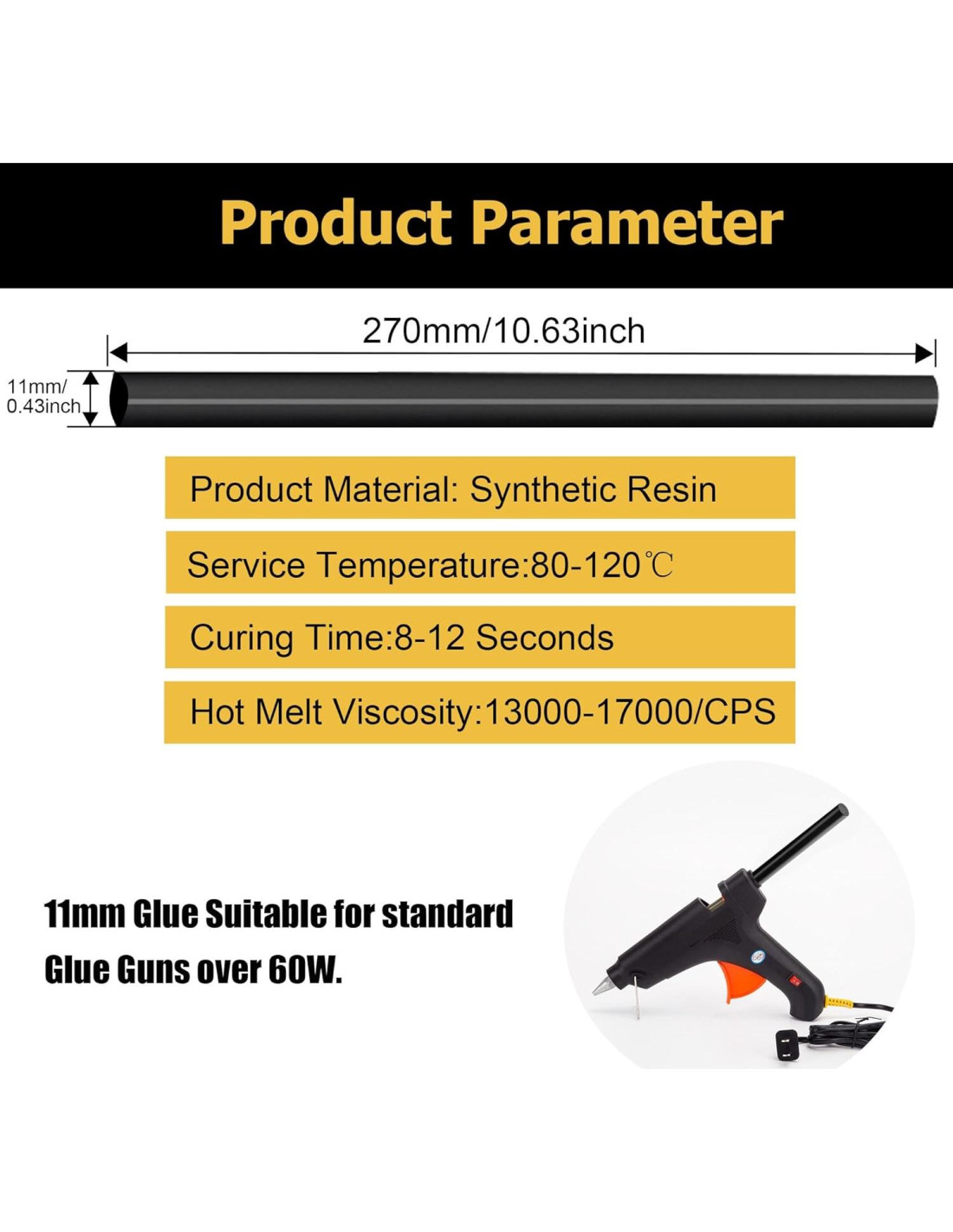 - Parámetros del Producto: Tamaño del palo de pegamento: Negro: 11mm*270mm, Amarillo: 11mm*260mm; Temperatura de servicio: 80-120C; Tiempo de curado: 8-12 segundos; Viscosidad de fusión en caliente: 13000-17000/CPS.
