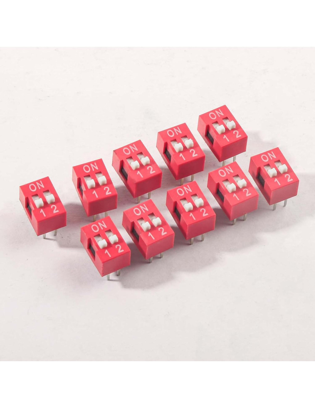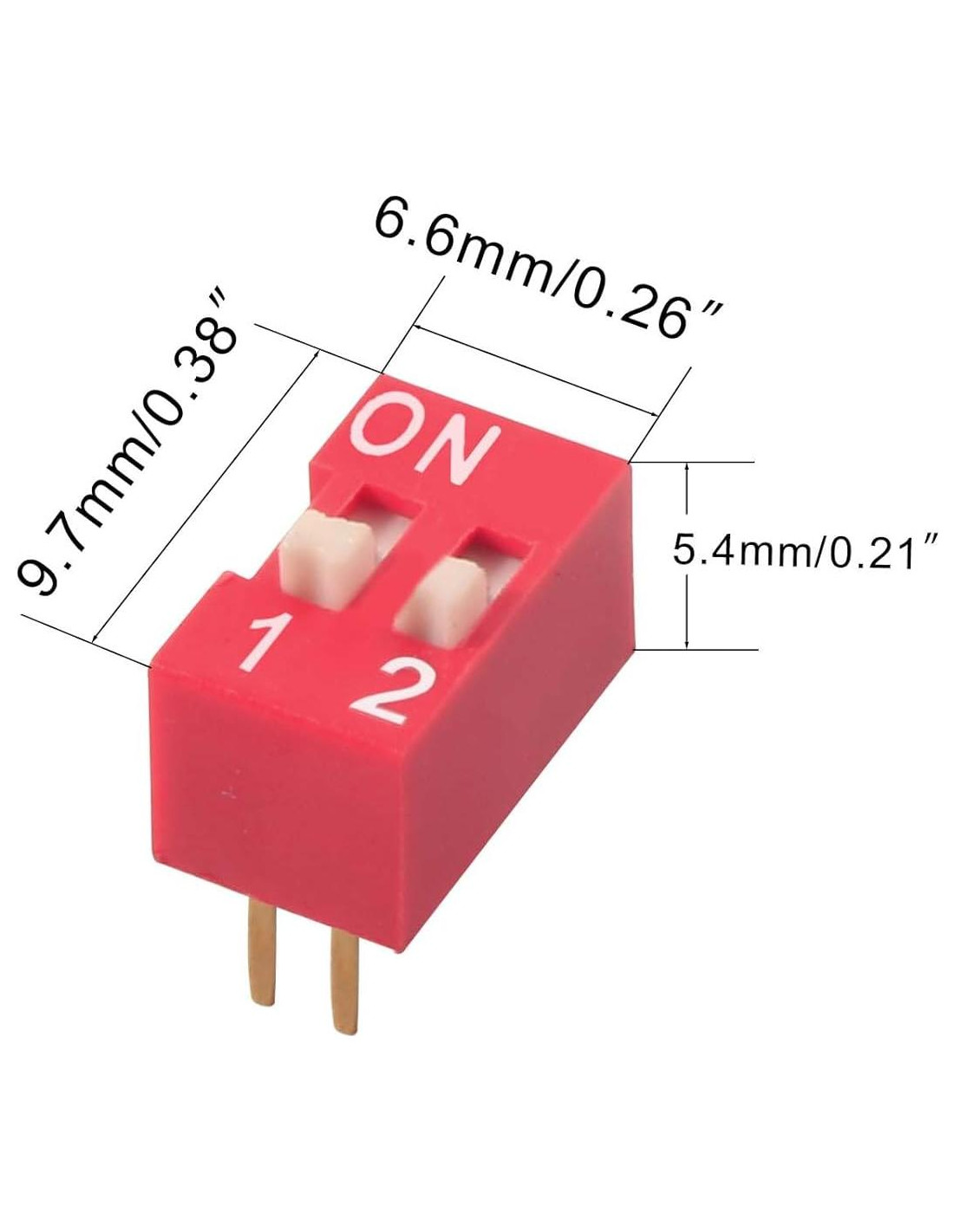 Parámetros Posición: interruptor dip de 2 posiciones Cantidad: 20pcs Color: rojo distancia: 2.54 mm Tipo del interruptor dip: tipo deslizante de 2 pines Calificación No Conmutada: 100mA 24V DC Calificación de Conmutación: 25mA 24V DC Resistencia de Contacto: 50 Resistencia de Aislamiento: 500M/DC500V El interruptor dip de tipo deslizante doble es adecuado para breadboards, placas de circuito, proyectos de PCB y otros productos utilizados en procesamiento de datos y comunicación.
