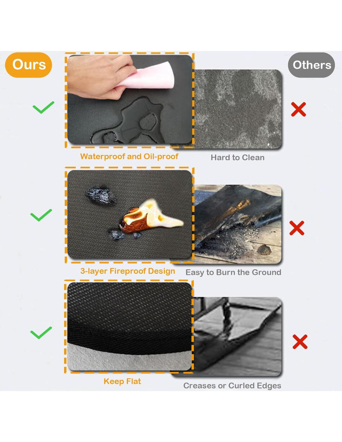 - [Proteger terraza y césped]: El tamaño de nuestro mat a prueba de fuego es de 48 x 30 pulgadas (121.92 x 76.2 cm), 1 mm de grosor, protege el área debajo de la parrilla de altas temperaturas y fuego, y recoge cualquier salpicadura y manchas de comida, mantiene las terrazas, patios y céspedes limpios y ordenados