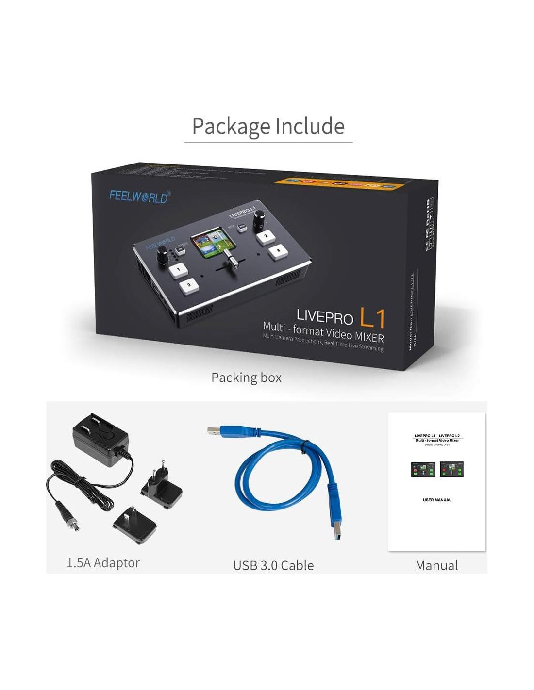 Deja que tu video haga que la transmisión en vivo sea más fácil. FEELWORLD se ha comprometido a proporcionar soluciones de monitoreo y transmisión completas para cineastas profesionales. Ya sea la actualización de la excelente tecnología de visualización de HD a FHD o a resolución UHD 4K, FEELWORLD tiene como objetivo apoyar a los creadores profesionales para obtener mayores beneficios y crear historias más emocionantes, con la tecnología más avanzada para mejorar la eficiencia de producción. Producción en vivo multicámara de bajo costo con características avanzadas de transmisión. LIVEPRO L1 con 4 entradas HDMI y 1 salida HDMI, todas ellas soportan 1080p. Para la transmisión en vivo, hay una interfaz USB3.0 y además, el puerto LAN para controlar y actualizar; para audio, tiene 2 interfaces, una para entrada y la otra para salida. Todo esto facilita la creación de producciones profesionales multicámara. Es capaz de transmitir cualquiera de las 4 entradas HDMI a cualquier plataforma de transmisión en vivo a través de software de transmisión en vivo de terceros como OBS. Simplemente conecta el LIVEPRO L1 y puedes cambiar en vivo entre 4 entradas de cámaras de video de alta calidad para imágenes de calidad dramáticamente mejor. O conecta una computadora para diapositivas de PowerPoint o consolas de juegos. Actualización del LIVEPRO L1. Para mejorar la experiencia del usuario, hemos actualizado el conmutador LIVEPRO L1, actualizando el diseño y material de la parte inferior, es más ligero y más fácil de disipar el calor. Solución de entrada HDMI SMPTE 720p@50/60 | 1080p@23/24/30/50/60 VESA 1024x768@60 | 1280x720@60 | 1280x768@60 | 1360x768@60. Solución de salida HDMI SMPTE 720p@60 | 1080p@60 | 1080p@30/50 VESA 1024x768@60 | 1280x720@60 | 1280x768@60 | 1280x1024@60 | 1360x768@60. LIVEPRO L1 con AUDIO EN y SALIDA. La interfaz de salida se puede conectar a altavoces, auriculares, etc.; La interfaz AUDIO EN es una interfaz de entrada lineal, que se conecta a señal digital. El micrófono recoge señales analógicas, por lo que cuando el micrófono se conecta directamente a la interfaz de entrada de audio del LIVEPRO L1, no hay forma de recibir audio. Soluciones para problemas de audio en transmisión en vivo: - Si hay micrófono e interfaz de audio, conecte el micrófono a la interfaz de audio y conecte la interfaz de salida de la interfaz de audio a la interfaz AUDIO EN del LIVEPRO L1. - Si hay micrófono pero sin interfaz de audio, conecte el micrófono a la interfaz MIC de la computadora. - Si hay micrófono inalámbrico y tiene interfaz de auriculares, conecte esta interfaz a AUDIO EN del LIVEPRO L1. Nota: Debido a que hay una variedad de micrófonos inalámbricos, si no puede usarlos normalmente cuando se conectan directamente al LIVERPRO L1, utilícelo con interfaz de audio o amplificador. - Si hay dispositivo de MIC a salida de línea, conéctelo a AUDIO EN del LIVEPRO L1. Solución de entrada: HDMI SMPTE 720p@50/60 | 1080p@23/24/30/50/60 VESA 1024x768@60 | 1280x720@60 | 1280x768@60 | 1360x768@60. Solución de salida: HDMI SMPTE 720p@60 | 1080p@60 | 1080p@30/50 VESA 1024x768@60 | 1280x720@60 | 1280x768@60 | 1280x1024@60 | 1360x768@60. Modelo: LIVEPRO L1. Tamaño de pantalla: 2.0" Pantalla LCD. Retroiluminación: LED. Entrada: 4 X HDMI. Salida: 1 X HDMI, 1xUSB 3.0 Tipo A. Audio In: 1x3.5mm Jack Estéreo. Audio Out: 1x3.5mm Jack Estéreo. Voltaje de entrada: DC 12V / 1.5A. Potencia máxima: 18W. Temperatura de trabajo: -30C~50C. Humedad: 10%~85%. Tamaño de la unidad: 185(L) x 110(W) x 39(H)mm. Peso de la unidad: 648g.