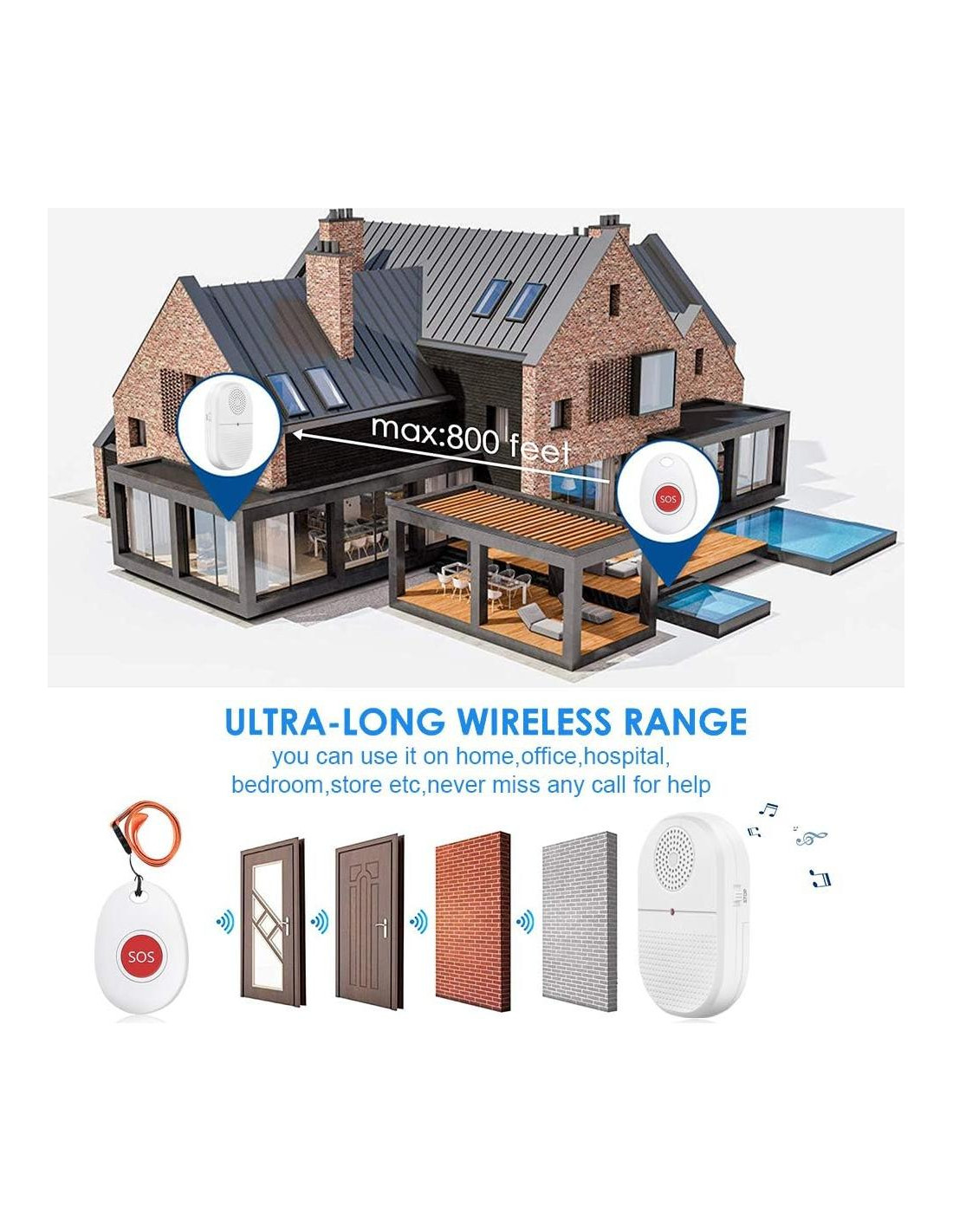 - [Largo Alcance] El botón de llamada para ancianos en casa tiene un rango de operación de 800+ pies en área abierta. Cada receptor portátil inalámbrico puede trabajar con 50 botones de llamada, cada transmisor puede emparejarse con 50 receptores y configurarse para diferentes o la misma música, y el pagador tiene un recordatorio de batería baja para tranquilidad.