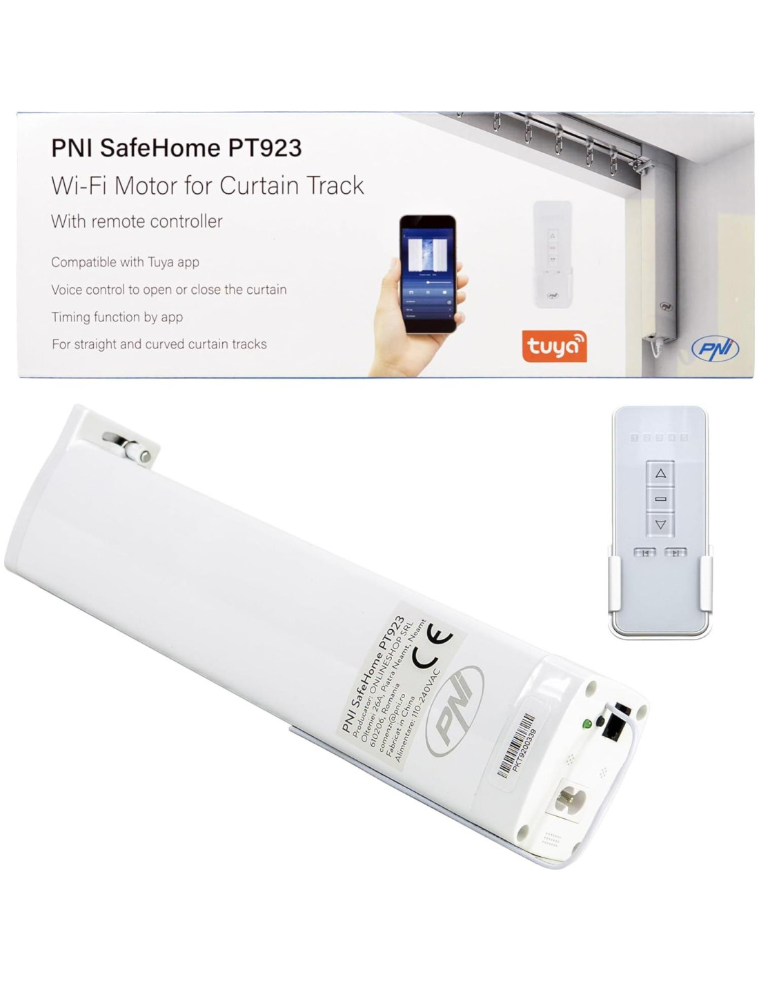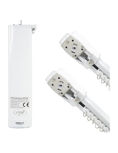 Identificación del producto Código del producto PNI-PT923 Fabricante PNI Color: blanco. Características Potencia nominal: 48 W. Corriente nominal: 2 A. Par nominal 1.5-2 nm. Voltaje de entrada: 230 V. Comunicación 2.4 GHz, 802.11 b/n/g WiFi. Compatible con la Aplicación Tuya Smart Dimensiones: 272 x 71 x 51 mm. Material: ABS + acero inoxidable. Carga máxima: 50 kg. Nivel de ruido: 38 dB. Longitud del riel: 0.3 m - 12 m. Clase de protección IP41.