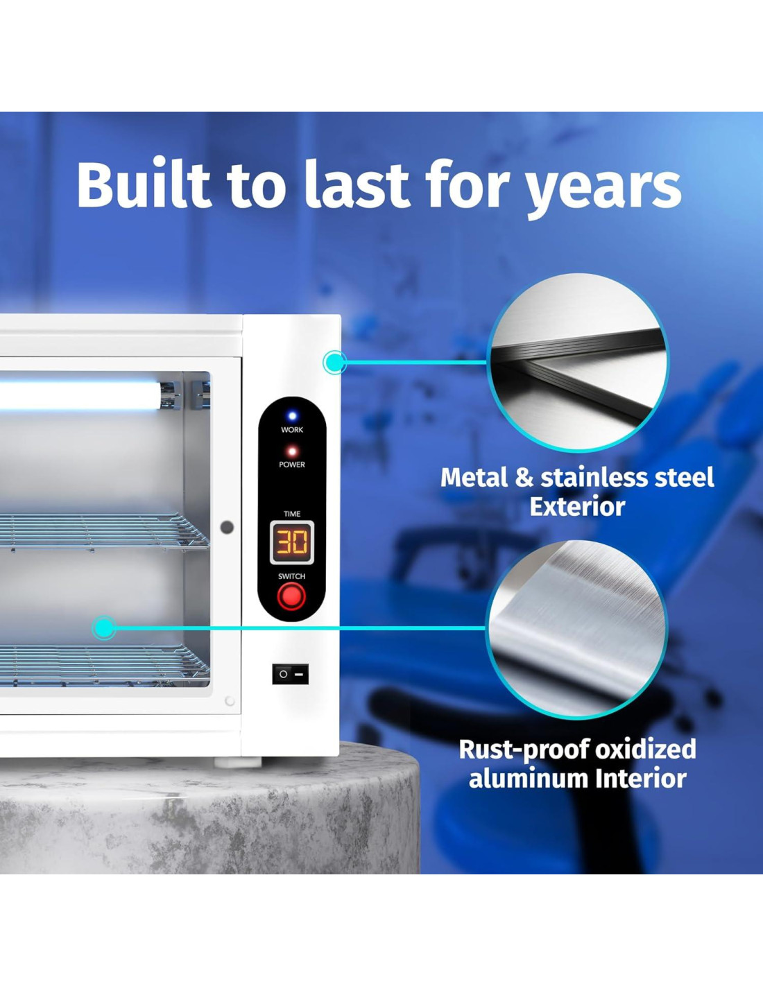 - PANTALLA DE TEMPORIZADOR LED - El Esterilizador UV tiene una puerta de vidrio resistente, un estante de metal y un armario interior hecho de acero inoxidable con una brillante luz LED. Para mantener los rayos peligrosos dentro y prevenir la exposición accidental, el armario esterilizador tiene una puerta aislada y un sistema de apagado automático. La luz ultravioleta se apaga cuando se abre la puerta y se vuelve a encender cuando se cierra.