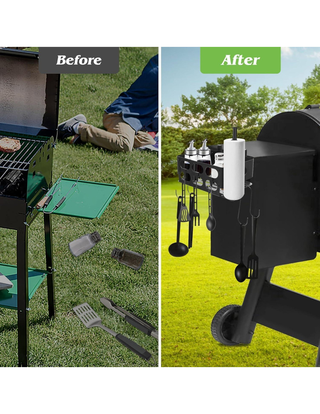 - Fácil de instalar: Primero, fija los ganchos traseros al organizador con tornillos (altura ajustable), luego, instala el soporte para toallas de papel con tornillos, e instala el organizador en la parrilla, engancha los ganchos para parrilla; por último, abre el embudo de tu parrilla y cuelga el contenedor de almacenamiento en cualquier lado del embudo.