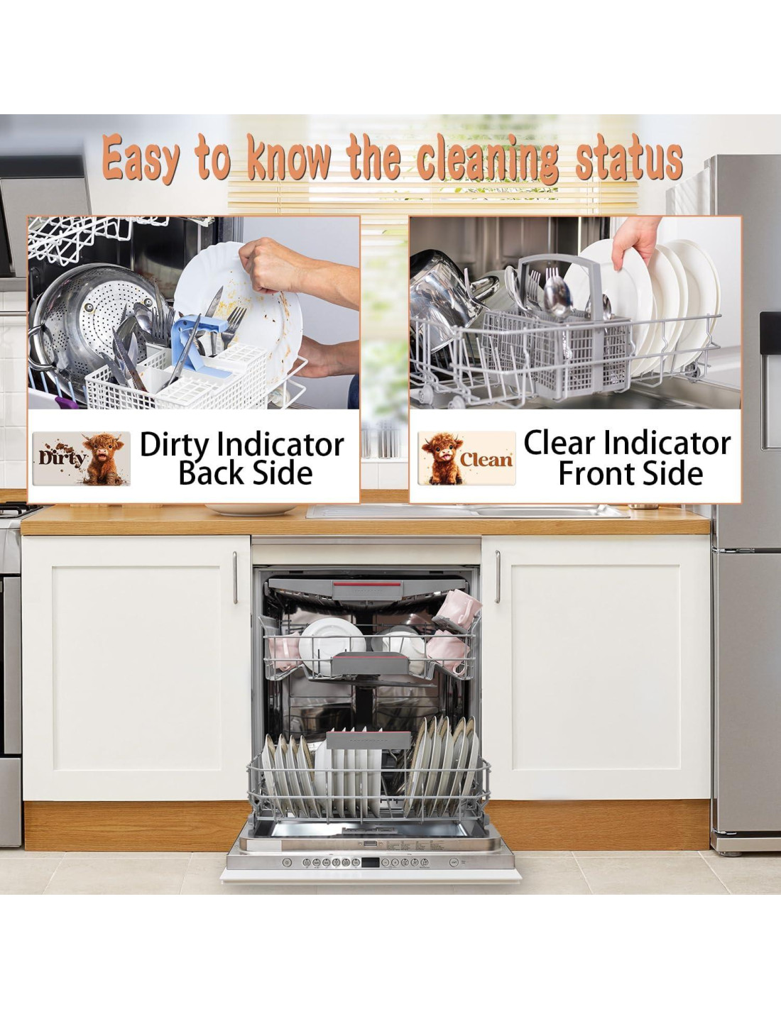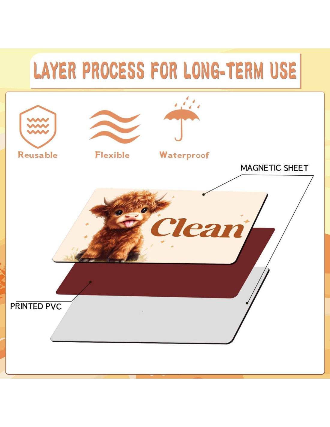 - [Diseño de Vaca de las Tierras Altas Lindo] Nuestro divertido imán de lavavajillas utiliza un patrón de vaca de las tierras altas lindo. Un lado tiene un fondo amarillo cálido con la palabra "LIMPIO" y una vaca de las tierras altas sacando la lengua. El otro lado es de color terroso con la palabra "SUCIO" y una linda vaca de las tierras altas. La combinación de colores es armoniosa y el texto es claro y fácil de leer, lo que facilita la identificación incluso desde la distancia.