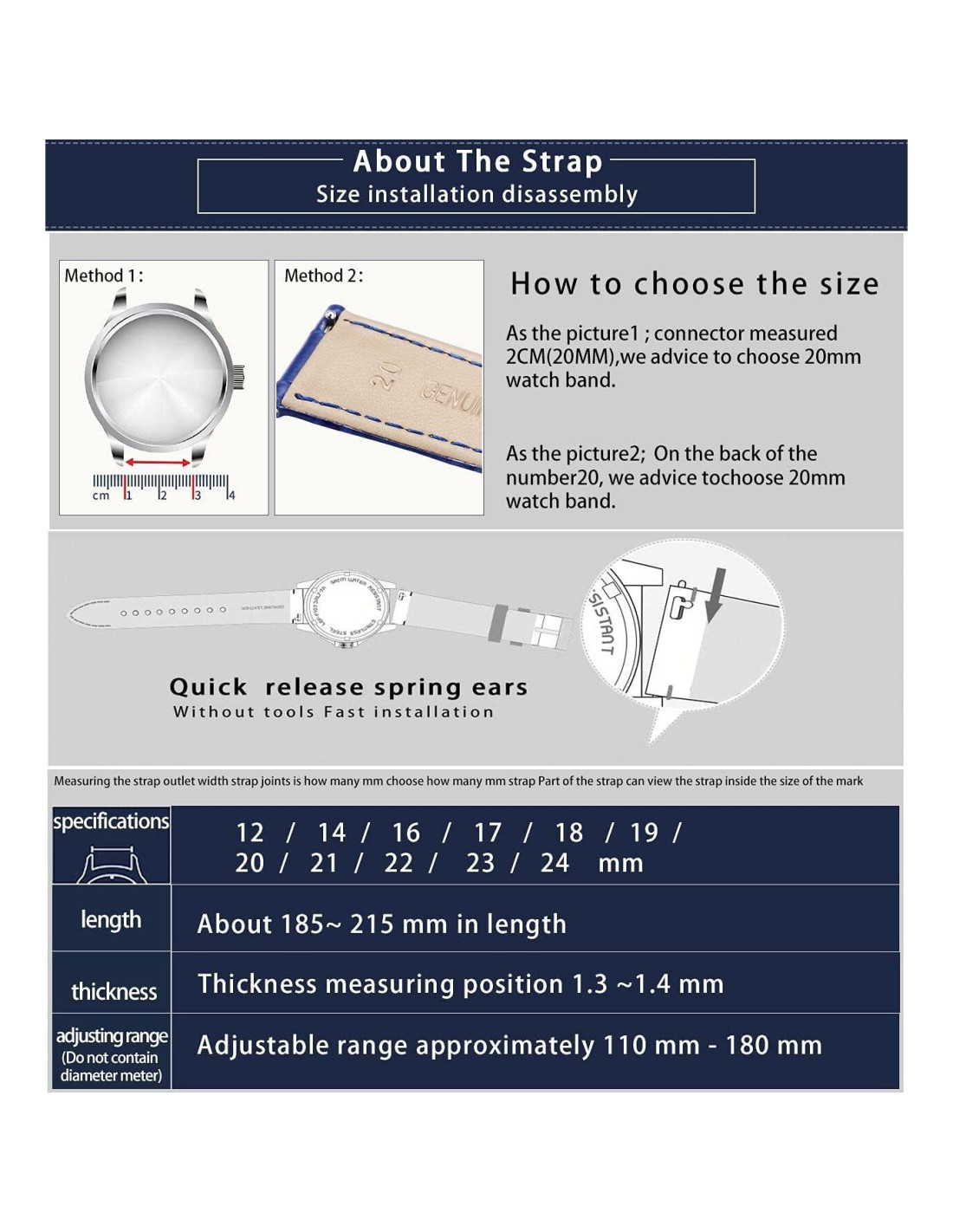 - Nuestra correa de reloj tiene una longitud regular. Por favor, mide con precisión el ancho de la lengüeta de tu reloj o el ancho de la correa actual para un tamaño correcto.